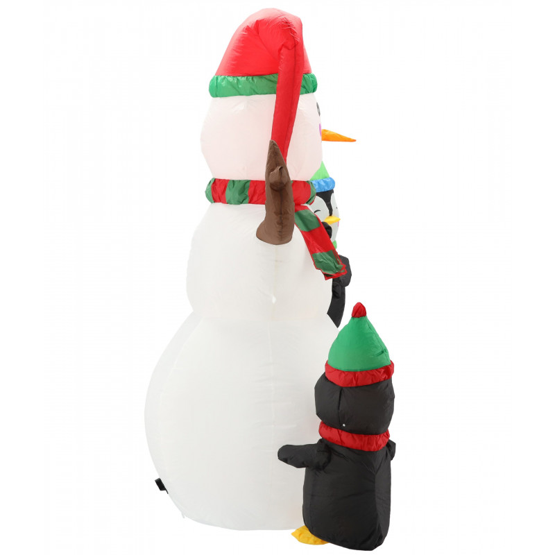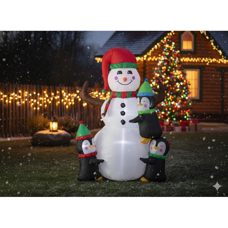 Scurta descriere: Omul de zapada gonflabil de 190 cm, acompaniat de pinguini decorativi si iluminare LED, aduce un farmec aparte decoratiunilor de iarna. Lumina puternica si designul prietenos transforma gradina, casa sau vitrina magazinului intr-un spatiu festiv si primitor.