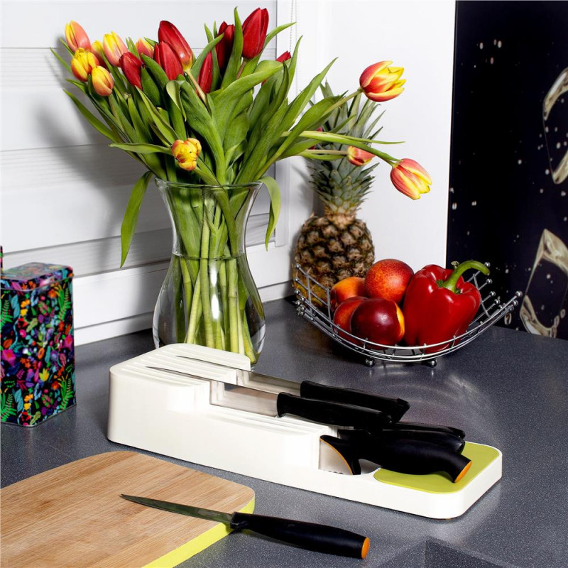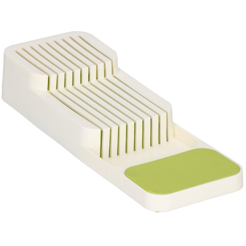 Latime: 13,7 cm Fabricat din plastic de inalta calitate Proiectat pentru 9 cutite Are un design unic, cu doua niveluri (pentru cutite cu lama scurta si cutite lungi)Proiectat pentru spalare manuala
