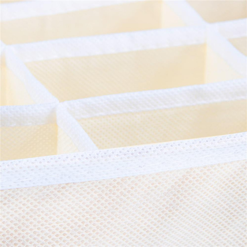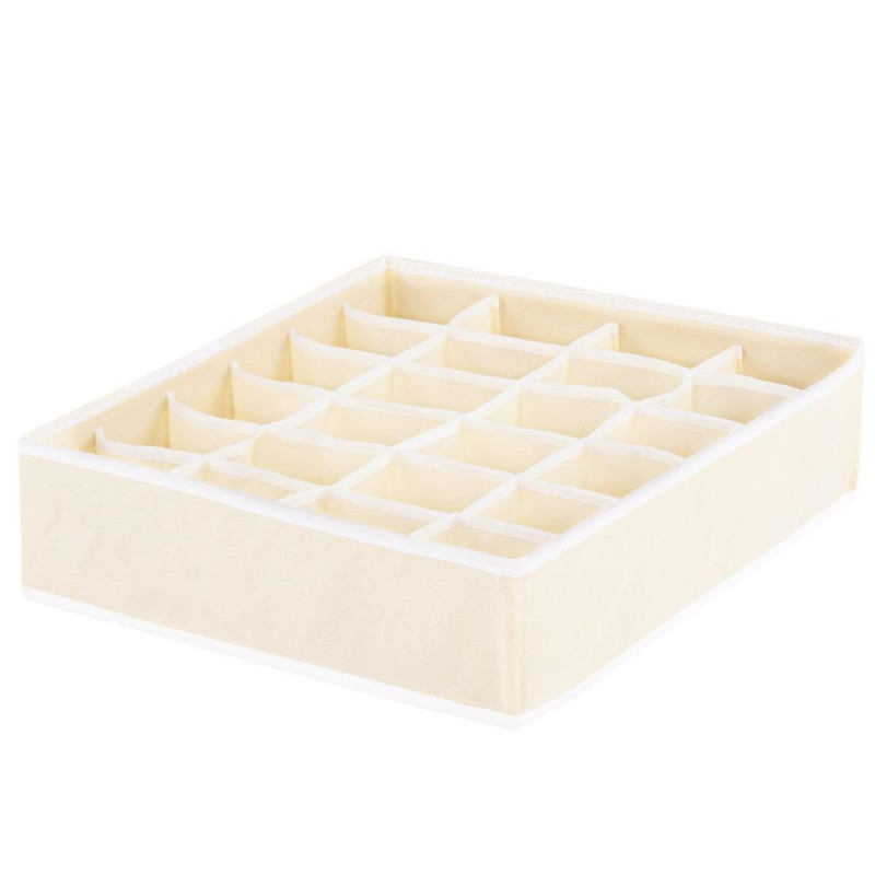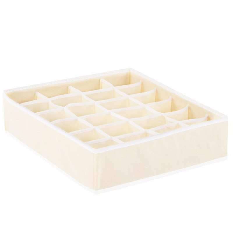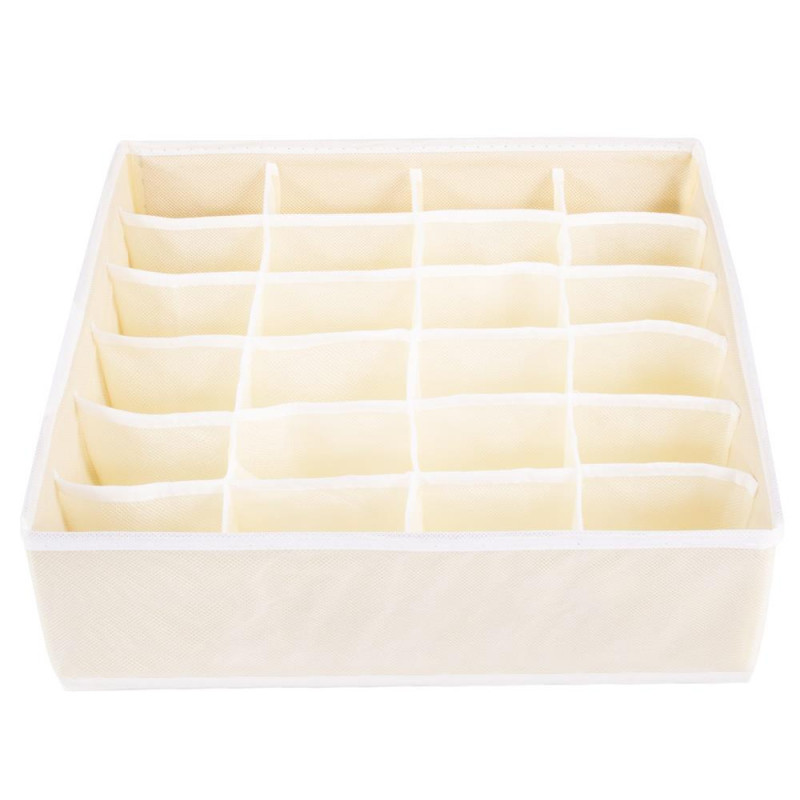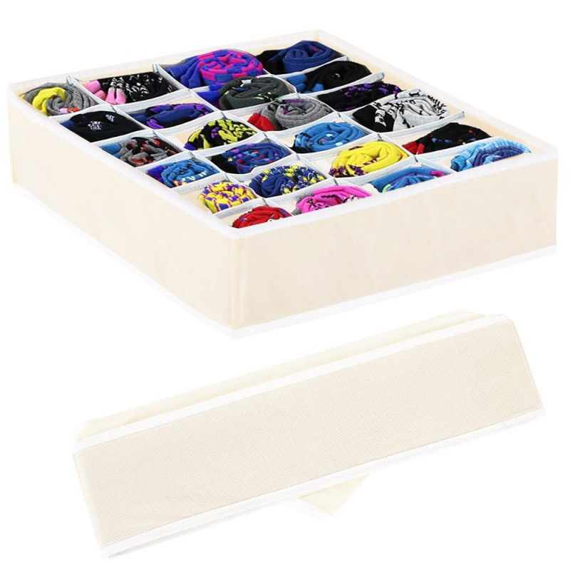Caracteristici: - organizator pliabil pentru sosete;- este prevazut cu 24 compartimente pentru depozitarea sosetelor, lenjeriei;- este confectionat din material textil netesut care permite circularea aerului;- este potrivit pentru sertarele standard;- structura stabila cu laterale rigidizate- sosetele si lenjeria pot fi depozitate in ordine, la indemana;- nu necesita mult spatiu pentru depozitare;-