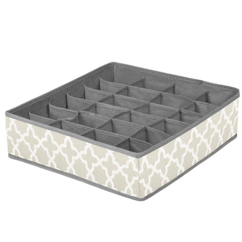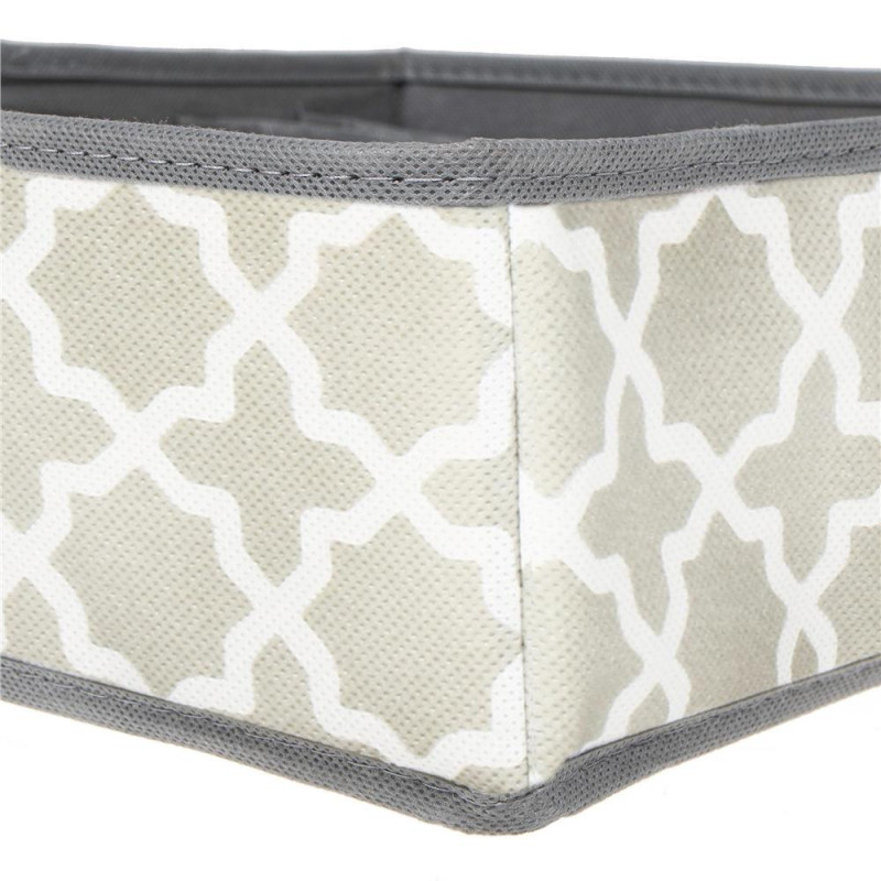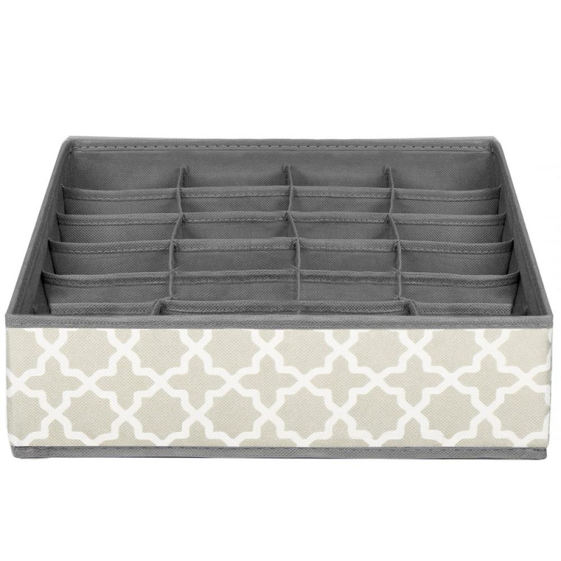 Caracteristici: - organizator pliabil pentru sosete;- este prevazut cu 24 compartimente pentru depozitarea sosetelor, lenjeriei;- este confectionat din material textil netesut care permite circularea aerului;- este potrivit pentru sertarele standard;- structura stabila cu laterale rigidizate- sosetele si lenjeria pot fi depozitate in ordine, la indemana;- nu necesita mult spatiu pentru depozitare;-