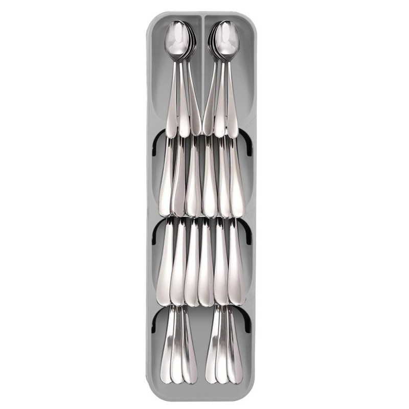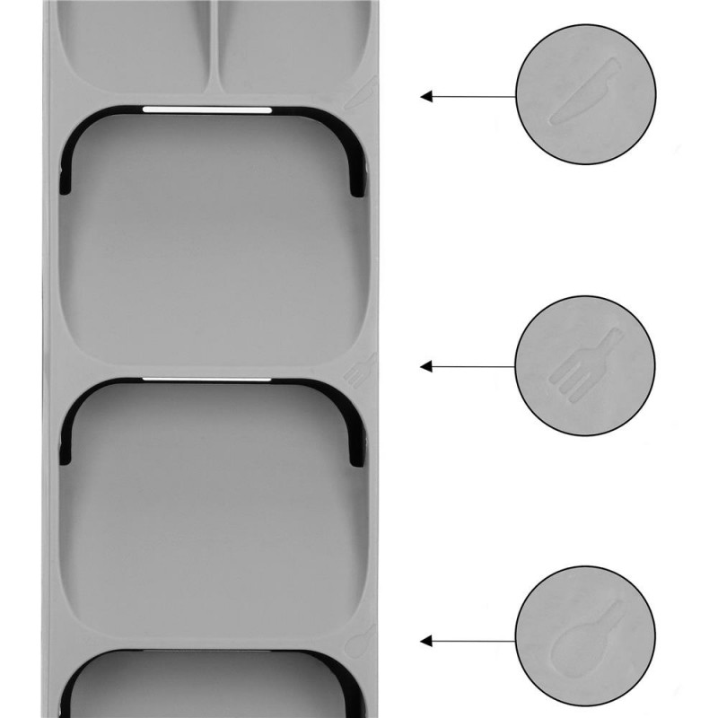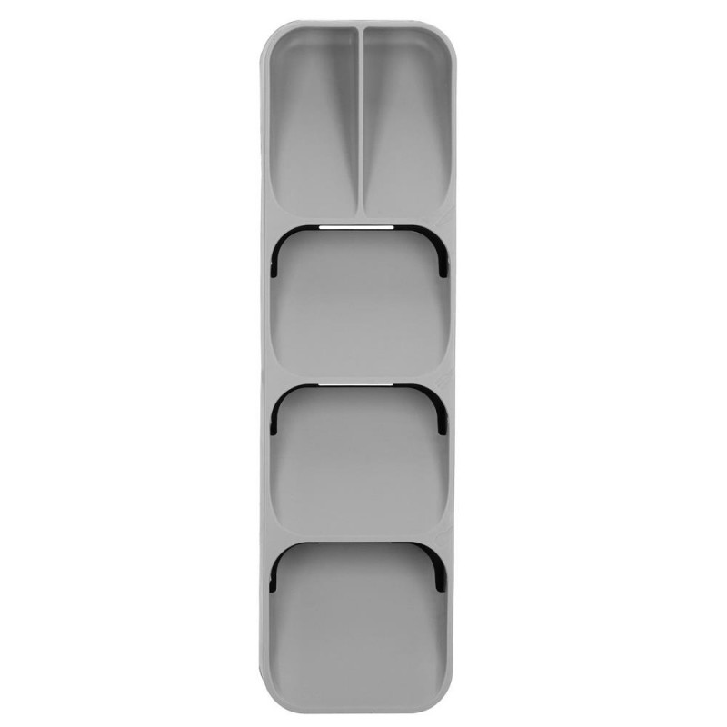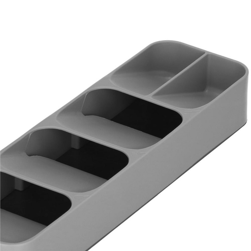 Organizatorul te va ajuta sa amenajezi cu usurinta spatiul dedicat tacamurilor. Un numar de compartimente selectat corespunzator il face un element indispensabil al echipamentelor de bucatarie. Organizatorul de tacamuri are 5 compartimente. Datorita acestui lucru, puteti aseza acolo linguri, lingurite, cutite si furculite. Avantajul sau suplimentar il reprezinta marcajele care faciliteaza organizarea spatiului pentru tacamuri. Este de remarcat faptul ca organizatorul va fi perfect atat intr-un sertar, cat si pe blatul de bucatarie. In interiorul sau, poate gazdui toate tacamurile pentru familie.