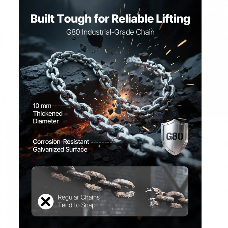 cu un lant din aliaj G80 de 6 m / 20 ft, cu grosimea de 10 mm, galvanizat