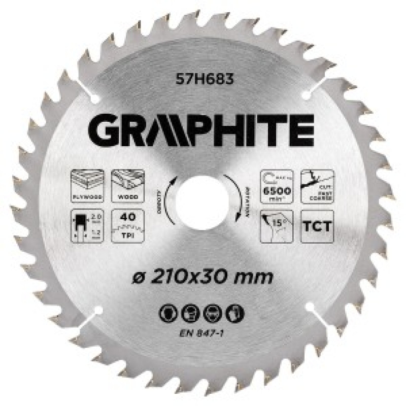 Lama de ferastrau, widia, 210 x 30 mm, 40 dinti 57H683 de la GRAPHITE este un accesoriu conceput pentru lucrul cu placaj si lemn, cu un diametru de 210 mm si un orificiu interior de 30 mm. Echipat cu 40 de dinti robust TCT. Grosimea lamei este de 1,2 mm, iar latimea dintilor este de 2 mm. Are o functie de taiere rapida si o viteza maxima de 6500 min-¹. Lama marca GRAPHITE este proiectata pentru ferastraul cu numarul 58GE121. Oferita cu reduceri de 25,4/20/16, este recomandata atat pentru utilizare profesionala, cat si pentru amatori.
