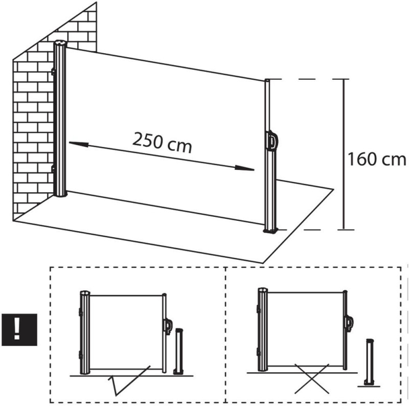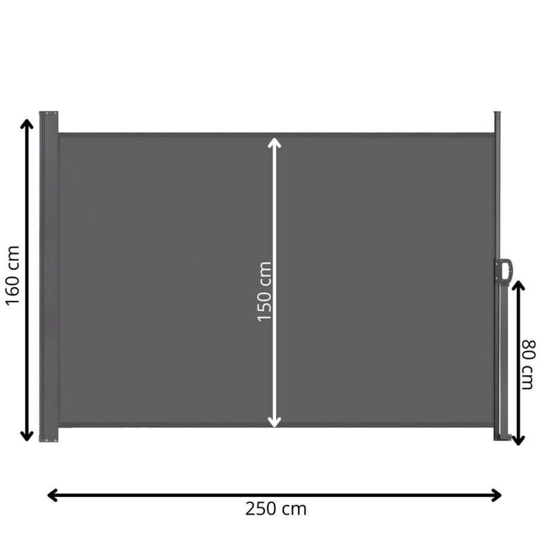 Profilul stalpului: 4 x 4 cm patrat Cortina laterala ofera o protectie confortabila impotriva razelor soarelui si a rafalelor de vant, este potrivita pe terasa, balcon sau gradina.Posibilitatea de a monta suportul in pozitia dorita va permite sa ajustati cu usurinta lungimea marchizei pentru a se potrivi nevoilor dumneavoastra. Lungimea maxima a marchizei este de 250 cm, astfel incat, indiferent daca este vorba de un balcon, o terasa sau o gradina, puteti acoperi cu usurinta o suprafata convenabila. Cadrul copertinei este fabricat din otel solid, asigurand rezistenta la conditiile meteorologice schimbatoare. In plus, finisajul acoperit cu pulbere garanteaza o protectie impotriva ruginii si a coroziunii rapide. Datorita constructiei solide a cadrului, marchiza ofera stabilitate, ceea ce permite o utilizare sigura.Kitul este livrat cu