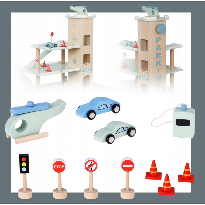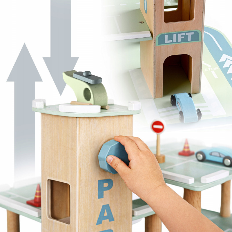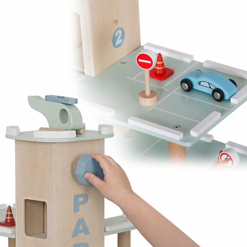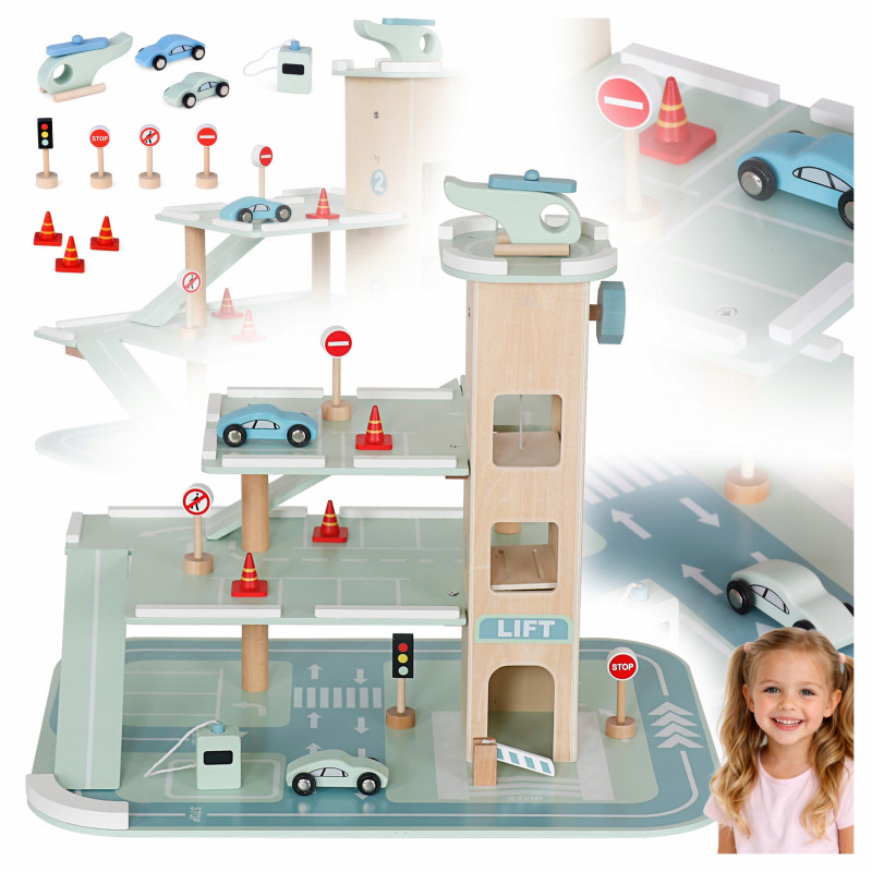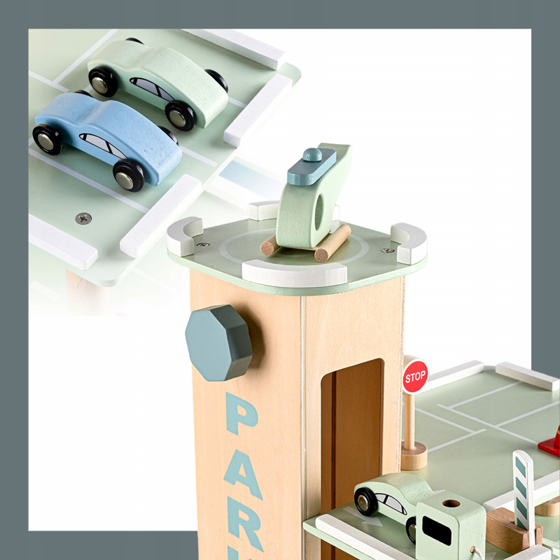 Scurta descriere Parcarea auto din lemn este o jucarie educativa complexa, conceputa pentru a stimula imaginatia si creativitatea copilului. Prevazuta cu 3 niveluri, lift actionat manual si heliport, ofera multiple scenarii de joaca realista cu masinute. Constructia solida si finisajele atent realizate asigura durabilitate si siguranta in utilizare. Este ideala pentru acasa, gradinita sau coltul de joaca.