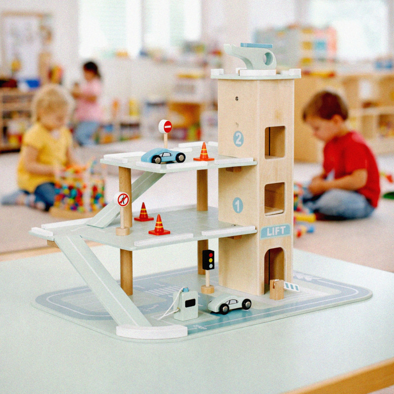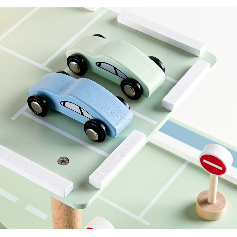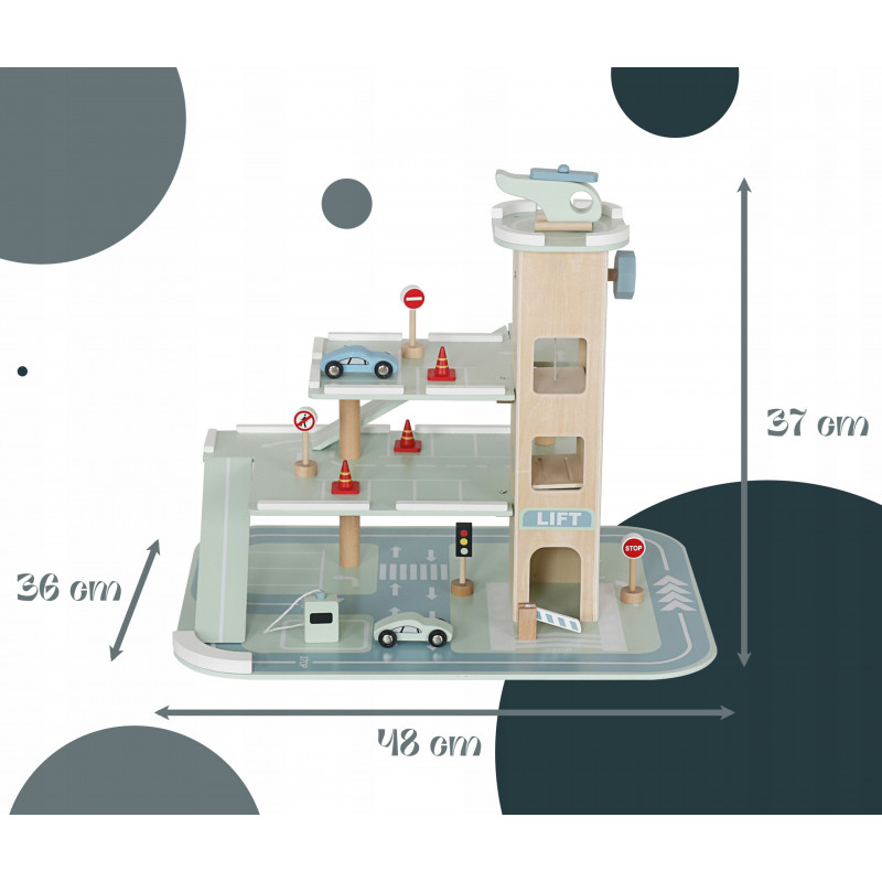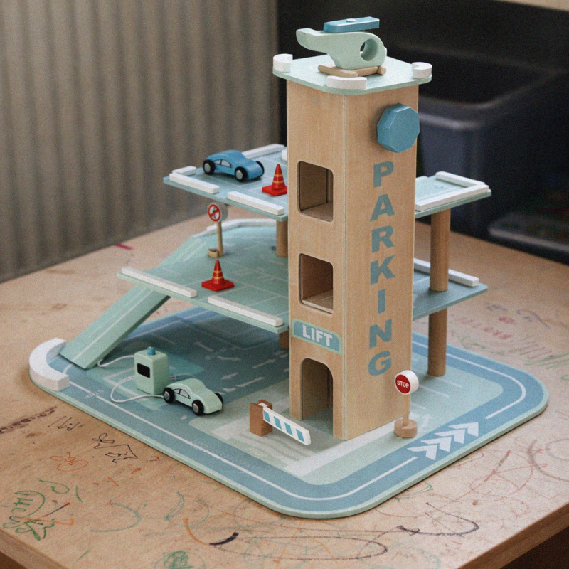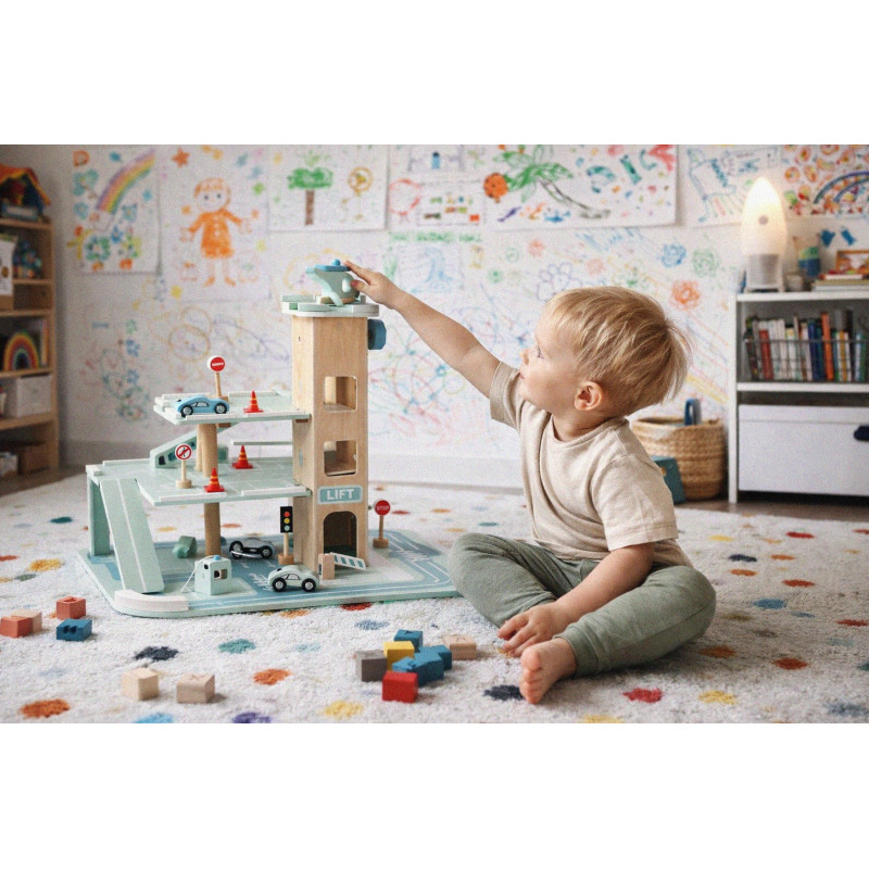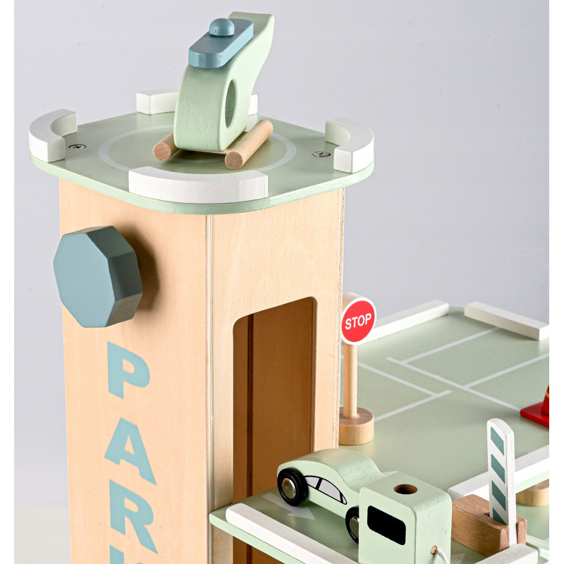 Scurta descriere Parcarea auto din lemn este o jucarie educativa complexa, conceputa pentru a stimula imaginatia si creativitatea copilului. Prevazuta cu 3 niveluri, lift actionat manual si heliport, ofera multiple scenarii de joaca realista cu masinute. Constructia solida si finisajele atent realizate asigura durabilitate si siguranta in utilizare. Este ideala pentru acasa, gradinita sau coltul de joaca.