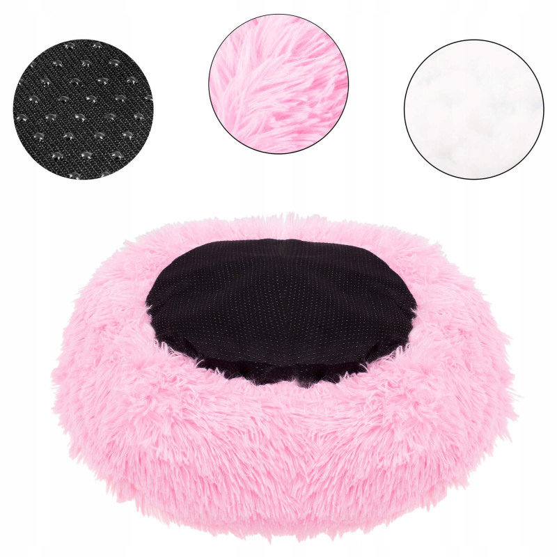 Baza antiderapanta Acest pat pufos pentru catei si pisici va oferi animalului de companie un loc confortabil pentru odihna si somn. Materialul extrem de placut si pufos ofera un confort extraordinar, oferind in acelasi timp cainilor sau pisicilor un colt cald si sigur. Culcusul prezentat va fi un loc din care animalul tau de companie nu va dori sa se miste! Structura placuta, moale Materialul din care a fost facut patul va permite fiecarui animal de companie sa se simta confortabil si placut. Puful lung, extrem de placut la atingere, va infasoara animalul de companie, mentinandu-l cald. In plus, materialul moale si delicat nu va irita pielea sau parul unui caine sau al unei pisici. Fundul antiderapant, lipit ferm de sol Un mare avantaj al patului este baza sa, care este echipata cu proeminente antiderapante, datorita careia acesta nu aluneca pe podea. Acest element asigura faptul ca produsul se lipeste de podea stabil si nu se misca atunci cand animalul de companie se aseaza in el. Potrivit pentru a fi spalat in masina Dupa cum stiti, animalelor de companie le place adesea sa se murdareasca si astfel pot murdari culcusul. Prin urmare, producatorul s-a asigurat ca acesta poate fi reimprospatat cu usurinta. Tot ce trebuie sa faceti este sa indepartati bumbacul de umplutura - ascuns in spatele fermoarului din partea de jos - si sa spalati patul la 30 de grade. In plus, posibilitatea de a patrunde in interiorul produsului permite inlocuirea umplerii acestuia. Atentie! Umplutura nu poate fi spalata! Functionalitatea merge mana in mana cu un aspect atragator Patul pufos nu este doar un element confortabil al spatiului animalului de companie, ci si un plus de design la interior. Culoarea frumoasa, manopera solida si forma atractiva fac ca produsul sa arate elegant si eficient. AVANTAJE fabricat dintr-un material placut de inalta calitate,