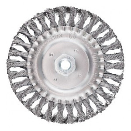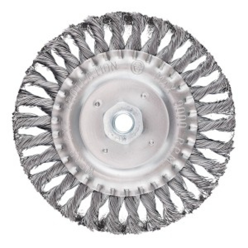 Periuta cu roata de sarma de 150 mm, fir de otel rasucit, M14, 57T433 de la GRAPHITE cu un diametru de 150 mm este fabricata din fir de otel rasucit. Echipata cu un filet M14, este proiectata pentru utilizarea cu polizoare unghiulare. Viteza maxima a sculei este de 9000 rpm. Produsul indeplineste cerintele EN 1083-2 si este potrivit pentru degrosarea suprafetelor metalice, curatarea agresiva, indepartarea ruginii, vopselei sau murdariei.