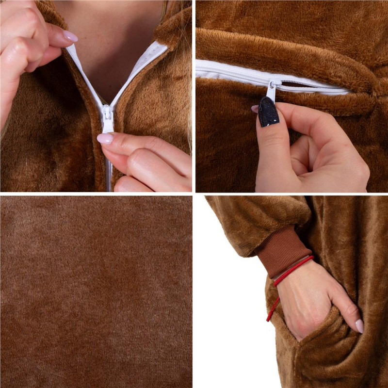 tesatura lucioasa care imita blana Pijamalele exceptional de dragute sunt ideale pentru toata lumea – indiferent de sex sau varsta. Materialul foarte calduros si placut la atingere este un articol indispensabil pentru zilele reci care se apropie. Pijamalele au o croiala supradimensionata, nu limiteaza miscarea si sunt ideale pentru uzura zilnica! Pijamaua este prevazuta cu nasturi, ceea ce faciliteaza punerea si scoaterea ei. Gluga, care este cea mai distinctiva caracteristica, va va mentine capul cald si confortabil, iar fermoarul din spate faciliteaza utilizarea toaletei. In plus, pijamaua este dotata cu 2 buzunare pentru depozitarea obiectelor mici, cum ar fi telefonul. Copiilor le place sa se costumeze, sa organizeze mascarade si sa joace diferite roluri. Cu atat mai mult, le plac personajele din desene animate, serialele animate si povestile de basm. Pijamalele noastre simpatice le vor permite sa devina pentru o clipa unul dintre aceste personaje. Aceste pijamale nu sunt distractive doar pentru copii! Poate fi purtata si de adulti. Este, de asemenea, o idee grozava de imbracat pentru a fi purtata la orice petrecere costumata!