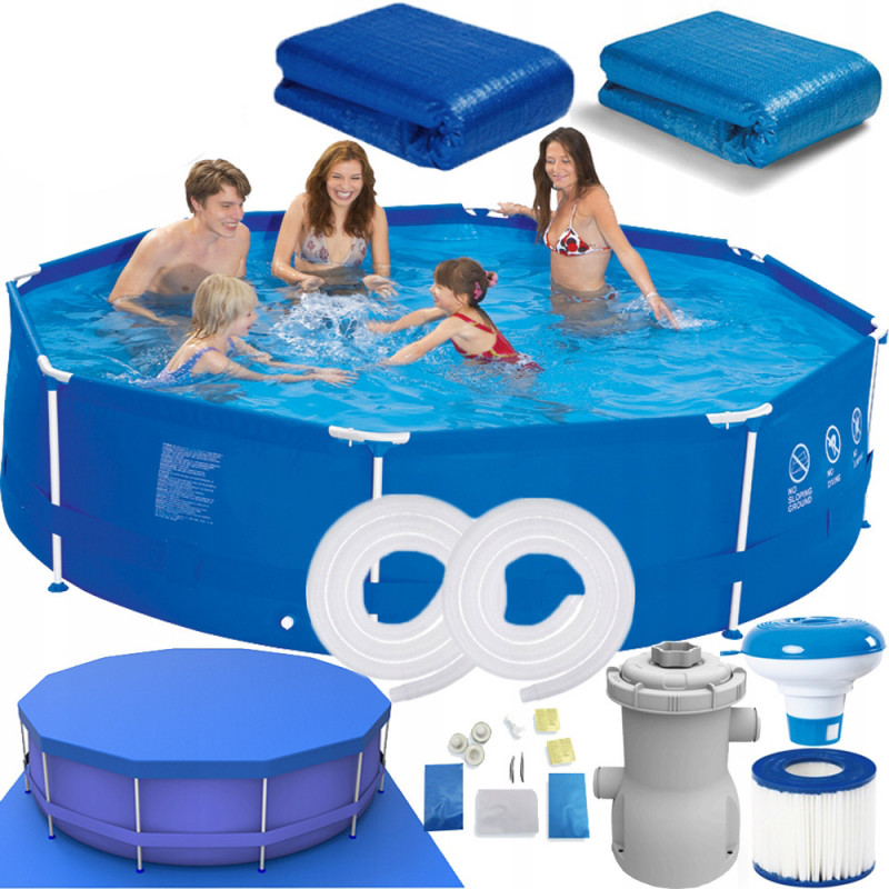 inaltimea piscinei: 76 cm Pompa eficienta 1136 L/h (300gal/h) + Filtru + Furtunuri + Cleme pentru impuritati Este cel mai important element al echipamentului piscinei. Va permite sa pastrati apa curata. Toate resturile plutitoare sunt atrase de pompa si depuse pe filtru. Filtrul in sine trebuie curatat si inlocuit in mod regulat. In plus, adaugam in set furtunuri, cleme si strecuratoare pentru impuritati, ceea ce va ajuta la mentinerea curateniei corespunzatoare a apei din piscina. Un filtru bun asigura o apa limpede. Nu este doar o investitie in apa curata, ci si sanatatea ta. Prelata acoperire piscina Acoperirea piscinei este cea mai usoara modalitate de a va proteja piscina de vremea nefavorabila! Datorita acesteia, piscina va fi protejata impotriva ploilor, iar apa din ea va fi lipsita de contaminanti precum de ex. caderea frunzelor si a insectelor. Micutii tai se vor putea juca si langa piscina fara teama, iar tu vei sti ca nu vor cadea inauntru. Husa este conceputa pentru piscine de tip rack cu cadru metalic, iar sforile cu ca este echipata vor facilita legarea acesteia. Covoras de piscina Covorasul protejeaza piscina de abraziunea de pe fund. In acelasi timp, este o izolatie termica impotriva scaparii caldurii in noptile racoroase. Covorasul este realizat din material rezistent. Este mai mare decat piscina in sine. Acest lucru face posibil sa stai pe el la iesirea din piscina sau inainte de a intra in ea. Acest lucru va permite sa curatati picioarele de orice murdarie care s-a blocat cand mergeti pe iarba. Dozator de clor Substantele chimice adecvate trebuie plasate in dozator pentru a mentine apa limpede. Adaugati tablete in dozator. Ele mentin apa curata pe tot parcursul sezonului. Dozatorul propriu-zis are functia de a regla intensitatea dozarii. Datorita utilizarii substantelor chimice, apa din piscina nu trebuie schimbata practic pe tot parcursul sezonului. Produsele chimice adecvate pentru piscina nu numai ca vor mentine apa curata, dar veti scapa si de germenii si algele nedorite. Neutilizarea substantelor chimice pentru piscina poate duce la contaminarea apei KIT pentru reparatii Pentru auto-reparare, nu ai nevoie decat de trusa de reparatii prezentata in aceasta oferta, plasturi cu adeziv deja asezati pe suprafata autocolantului. Folosirea lor este foarte usoara Suprafata perforata trebuie curatata si plasturele apasat pe suprafata perforata si gata :)