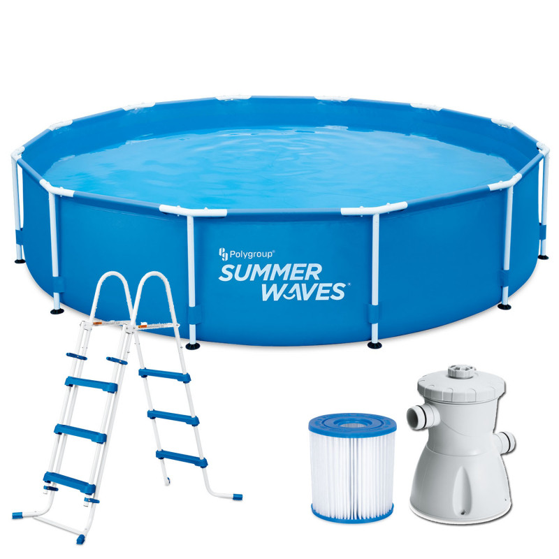 Piscina rotunda cu pompa cu filtru si scara acces incluse Summer Waves, diametru 366 cm, inaltime 91 cm, PVC/otel, albastru Summer Waves® 3,66 metri diametru si 91 cm inaltime, piscina rotunda cu picioare metalice, filtru de apa si filtru de hartie, scara inclusa in pachet