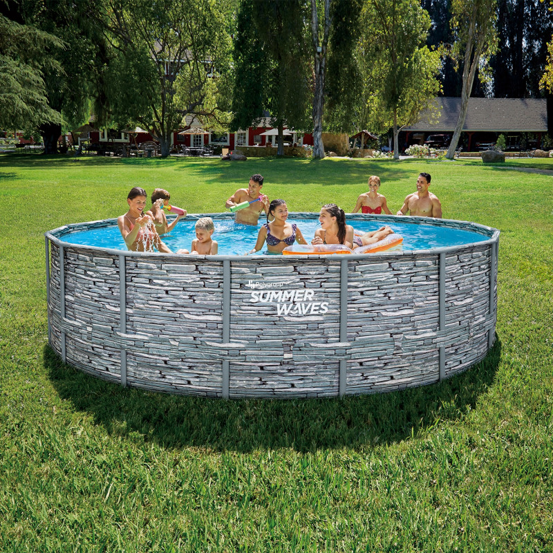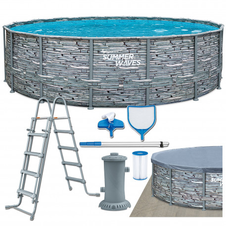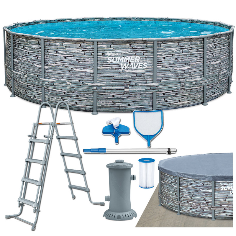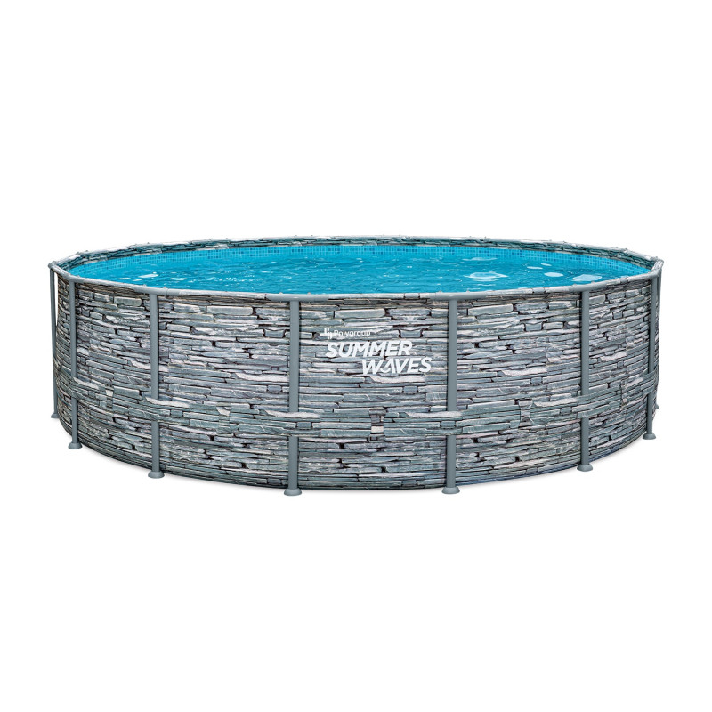 Piscina rotunda cu pompa cu filtru, prelata protectie si scara acces incluse Summer Waves, diametru 488 cm, inaltime 122 cm, PVC/otel, aspect piatra, gri Summer Waves® Picioare metalice de 4,88 metri in diametru si 1,22 cm inaltime, piscina rotunda cu model de piatra, cu model de mozaic albastru in interior, filtru de apa si filtru de hartie, scara si covoras de piscina, husa si kit de curatare de baza incluse in pachet