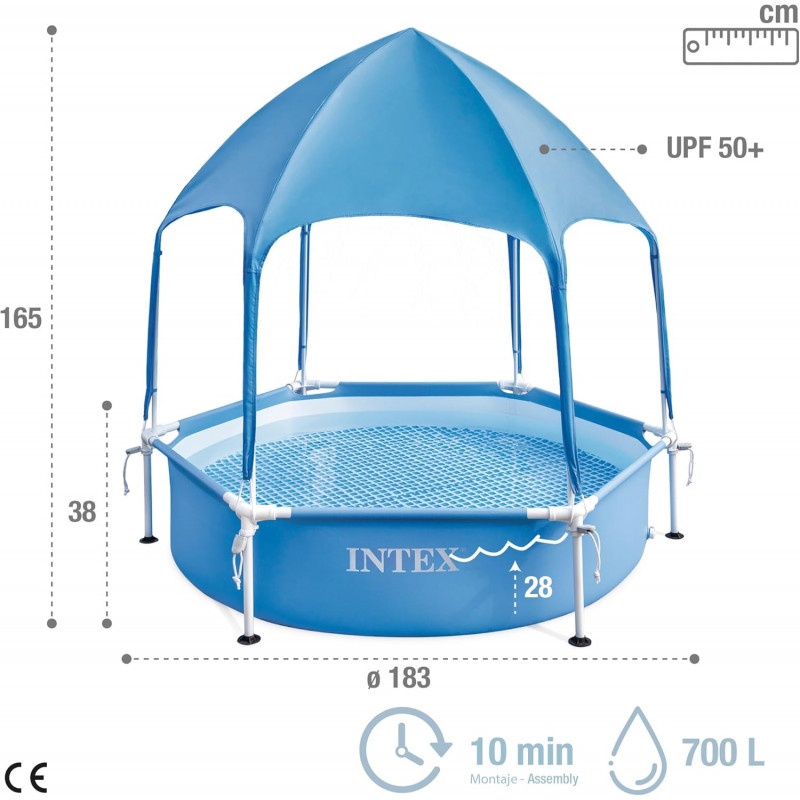 Piscina rotunda Intex 28290 NP cu cadru metalic si parasolar este conceputa special pentru a oferi copiilor o experienta sigura si distractiva in timpul verii. Cu un diametru de 183 cm si o adancime de 38 cm, aceasta piscina este ideala pentru cei mici, avand o capacitate de 700 litri si o structura robusta din otel. Materialul PVC cu 3 straturi asigura durabilitate si rezistenta la uzura, iar montajul este rapid si intuitiv. Copertina cu protectie solara UPF 50+ fereste copiii de razele UV, oferind in acelasi timp confort si umbra. Pulverizatorul reglabil integrat creeaza o ceata racoritoare, perfecta pentru zilele calduroase. Aceasta piscina este ideala pentru gradina sau curte si garanteaza ore intregi de joaca si racorire in siguranta. Specificatii generale