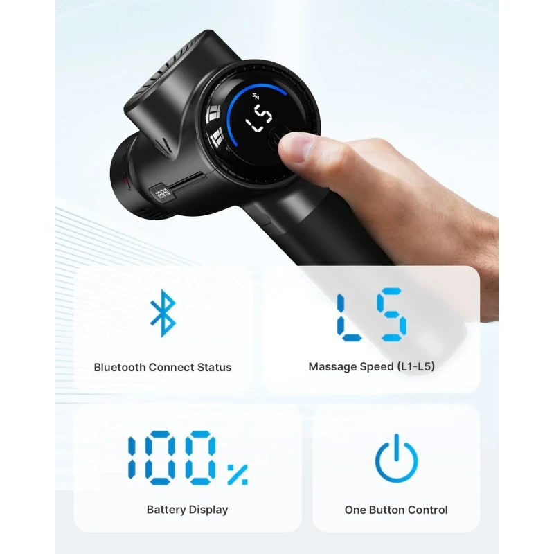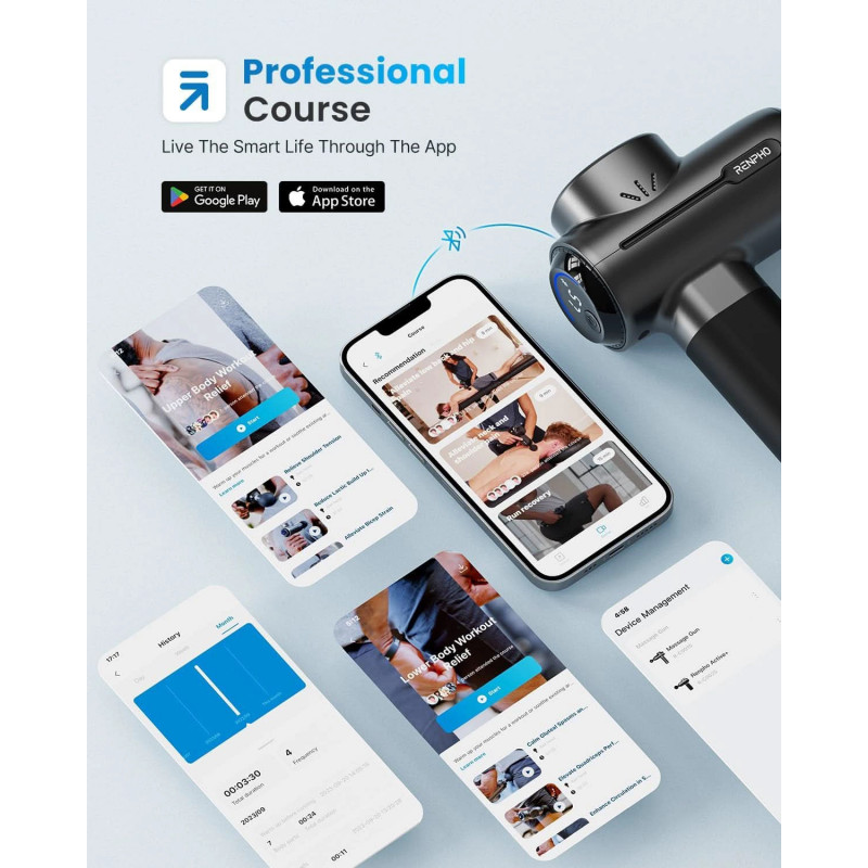 Conectează pistolul de masaj la aplicația Renpho Health prin Bluetooth pentru a selecta programe dedicate anumitor grupe musculare, a controla nivelurile de viteză și a monitoriza istoricul sesiunilor de masaj.