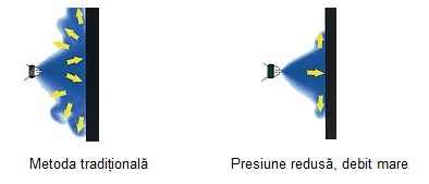 - Sistem HVLP cu presiune redusa. Presiunea mica de pulverizare reduce reculul si imprastierea vopselei