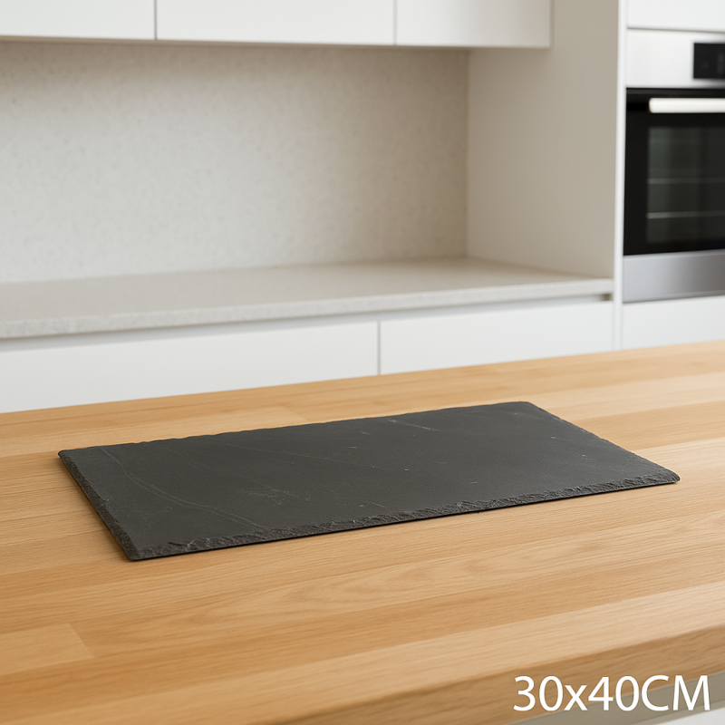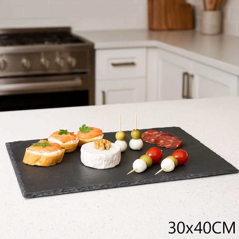 Scurta descriere Platou servire Atmosphera realizat din ardezie naturala de inalta calitate, ideal pentru prezentarea eleganta a branzeturilor, aperitivelor sau deserturilor. Suprafata mata si forma generoasa adauga o nota rafinata oricarei mese.