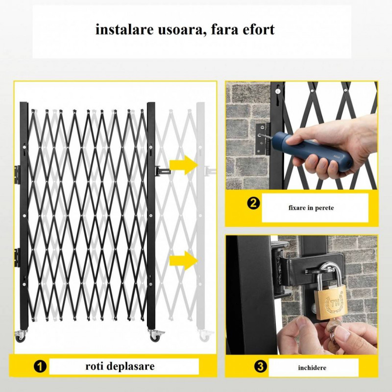 Poarta pliabila acordeon, Otel, Negru, 2 x roti, Latime
