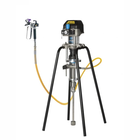 Pompa cu piston prin actionare pneumatica, rata transfer 28:1, protectie EX Necesita compresor 2,5-8bar, debit aer necesar 500 l/min. Intretinere facila: sectiunea fluida usor de schimbat, furtunul de aspiratie pivotant. Echipare standard: stand – 4 picioare furtun material DN4, max. 270 bar, NPS 1/4”, 7.5m furtun absorbtie cu sorb, furtun dublu, material DN16 pistol Airless AG14, G-Thread 1/4” – include garda protectie TradeTip 3 duza TradeTip 3, FineFinish 512 Filtru material DN6, PN270, G 1/4″, 1/4″ NPS-SSt Necesita compresor 2,5 – 8 bar, debit aer necesar 500 l/min.