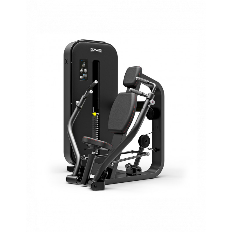 SPECIFICATII TEHNICE@- Cadrul din oțel armat de 3 mm.@- Tratament antirugină și protecție specială la punctele de sudură.@- Acoperire cu pulbere de poliester la 200º în negru mat.@- Polițe de transmisie FIBABS, cu rulmenți cu bile, realizate din material compozit foarte rezistent la frecare și adaptate la diametrul cablului.@- Cablu de transmisie cu grosimea de 6 mm, extrem de flexibil și rezistent. Include tensor pentru reglarea tensiunii.@- Protecție de încărcare termoformată față și spate, termoformată neagră capace de protecție a sarcinii.@- Opțional: personalizarea capacelor.- Tavă dublă suport obiecte în partea superioară.@- Scaunele și spătarele sunt nedeformabile sub presiune, realizate din poliuretan injectat (spumă).@- Tapițerie antibacteriană MRSA, SANITIZATĂ, ignifugă Standard M2, UNE 1021 și fără solvenți și substanțe nocive Standarde OEKO-TEX. Cusături roșii intense.@- Mânere de reglare realizate din aluminiu anodizat pentru a preveni rugina.- Mânere injectate cu material din cauciuc antiderapant, neporos.@- Scaun anatomic reglabil prin piston cu gaz.@- Goniometru din oțel inoxidabil cu 3 poziții pentru reglarea poziția de pornire/unghiul exercițiului.@- Mișcare convergentă.-Inoxidabil ghidaje pentru plăci din oțel.@- Plăci de 5 kg cu bucșe cu frecare redusă. @- Selector de sarcină cu sistem de siguranță magnetic și cablu de siguranță.@- Sarcina de lucru: 100 kg.@- Pictogramă de descriere a exercițiului.@- Cod QR cu acces la video de utilizare a mașinii.@- Dimensiuni: 116 x 168 x 157 cm.@- Declarație de conformitate CE.@- Utilizare comercială.