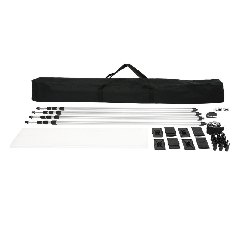 - Include 4 stâlpi ajustabili din aluminiu (1.5-3.9m) cu plăci de susținere pentru stabilitate.