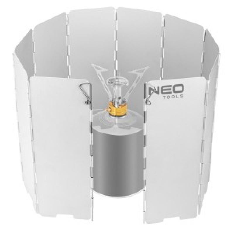 Scutul de protectie impotriva vantului pentru arzatori 63-142 de la NEO este alcatuit din 10 piese din aluminiu. Greutatea produsului este de 277 g. Scutul are o inaltime de 240 mm si o latime de 840 mm. Este oferit cu o carcasa de plastic pentru depozitarea si transportul convenabil al elementului. Este potrivit pentru toate tipurile de excursii in afara orasului, camping si alpinism. Este usor si usor de intretinut.
