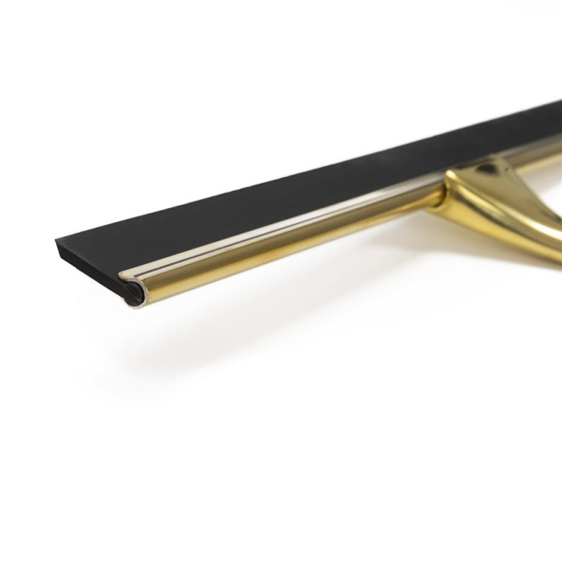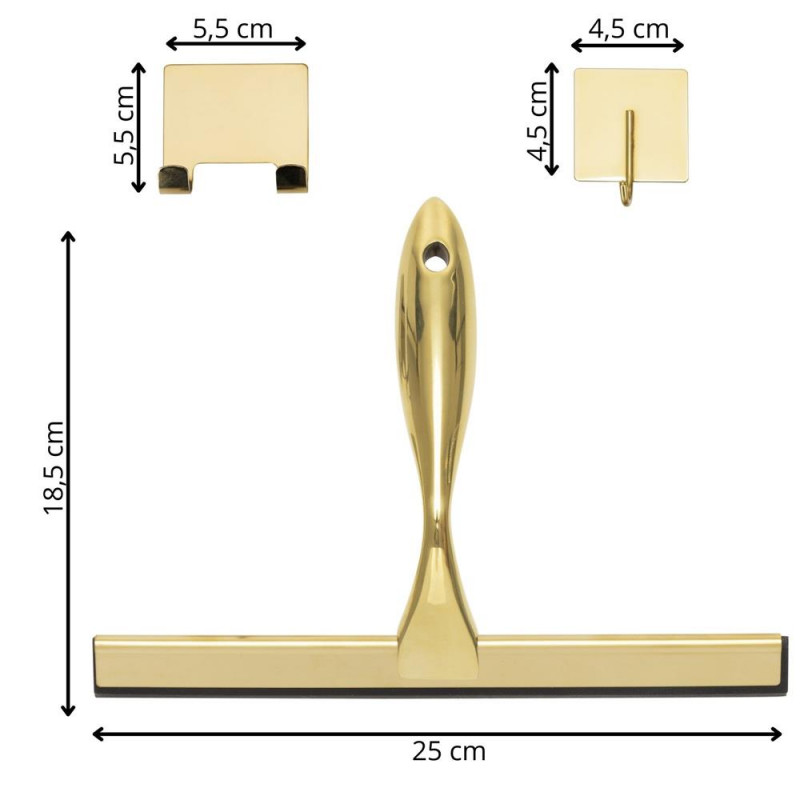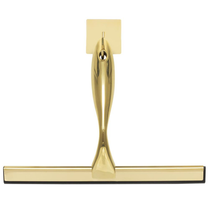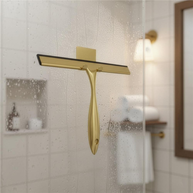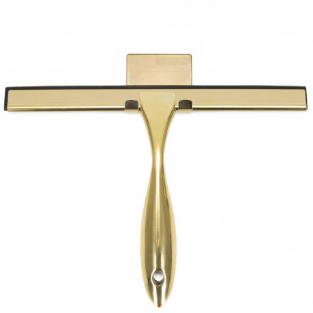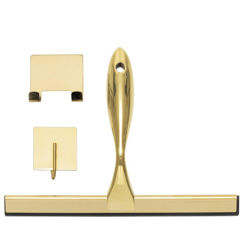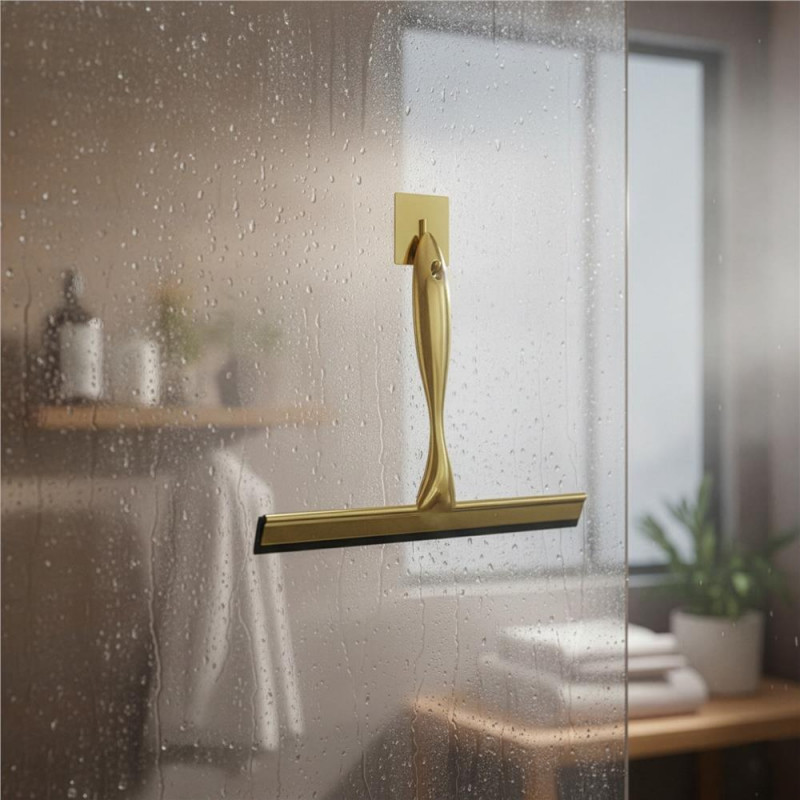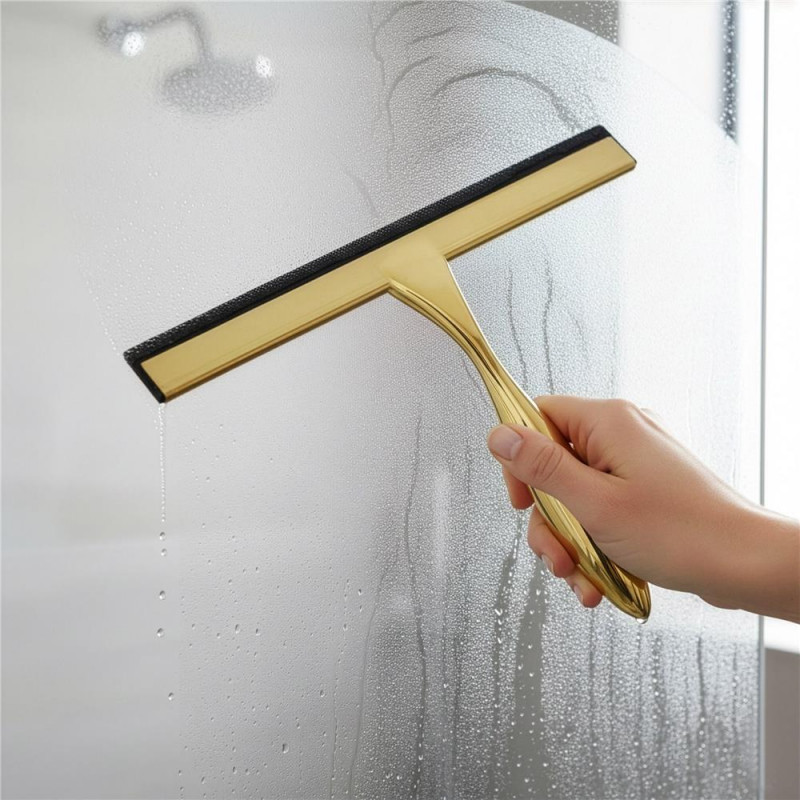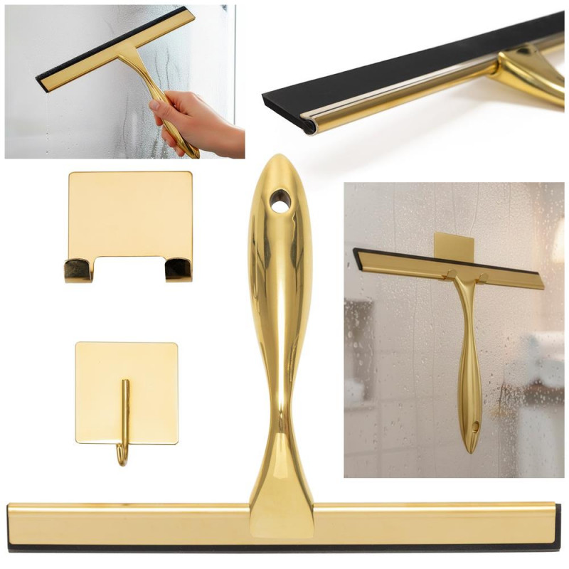 Scurta descriere: Racleta pentru baie realizata din otel inoxidabil cu finisaj lucios auriu, destinata indepartarii rapide a apei de pe suprafete netede. Manerul cu forma fluida ofera prindere confortabila, iar cele doua suporturi permit depozitare flexibila fara gaurire.