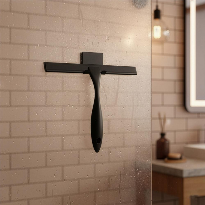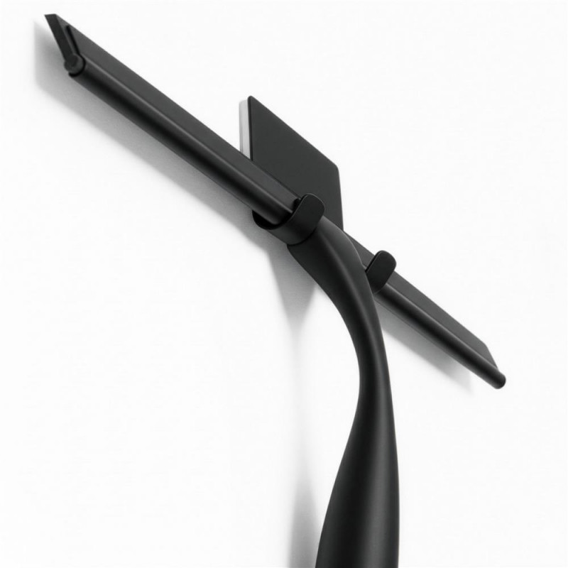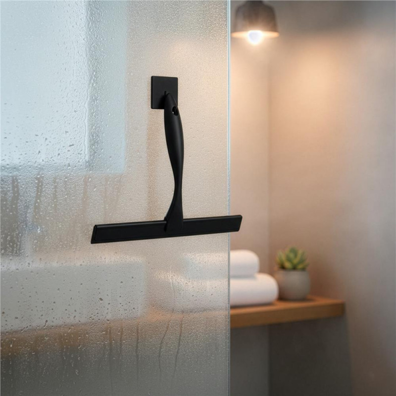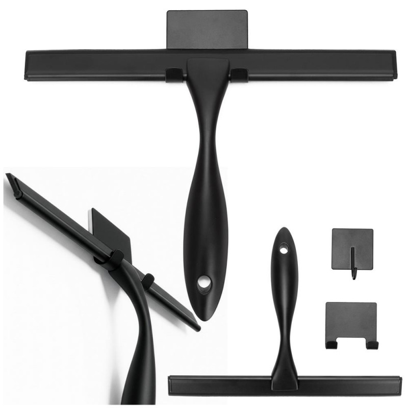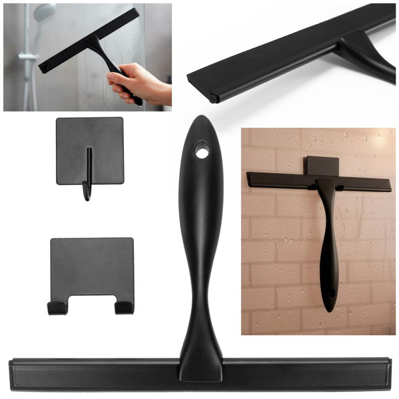 Scurta descriere: Racleta pentru baie realizata din otel inoxidabil cu finisaj mat negru, ideala pentru indepartarea rapida a apei de pe suprafete netede. Manerul ergonomic asigura control bun in utilizare, iar cele doua suporturi adezive permit montaj fara gaurire.