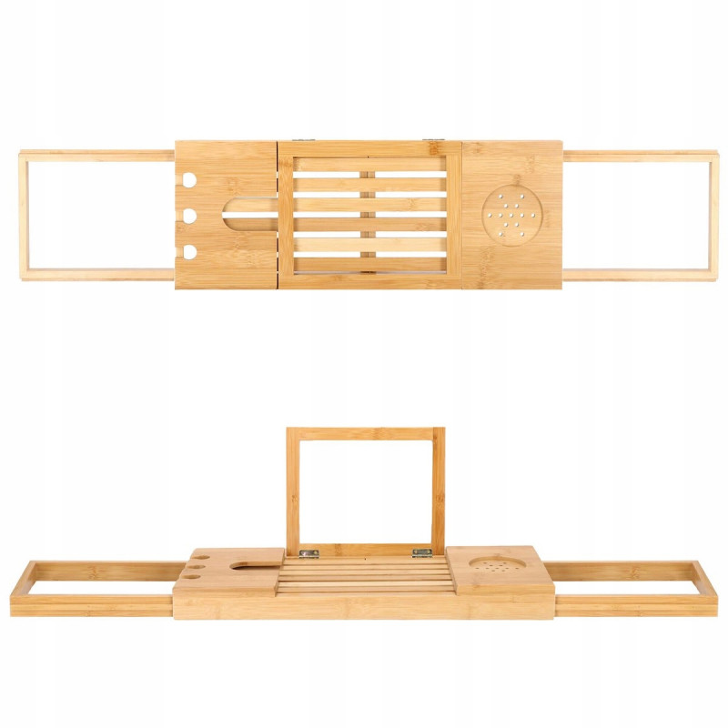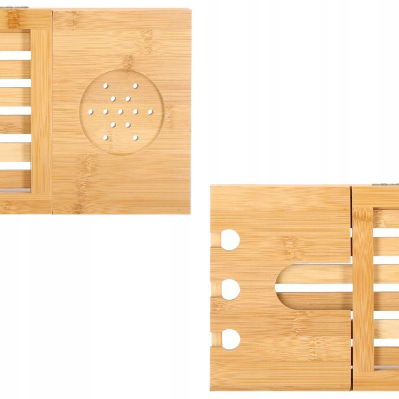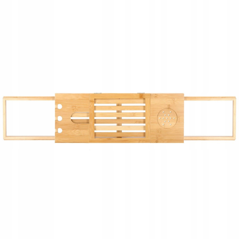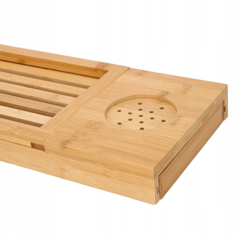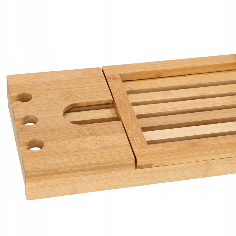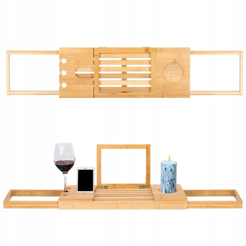 Puncte forte: stabilitate, functionalitate, versatilitate, performanta estetica FUNCTIONALITATERaftul are o functie de reglare a latimii in intervalul 50 cm - 93 cm, datorita careia poate fi adaptat la majoritatea cazilor. Raftul este spatios, poate adaposti produse cosmetice, accesorii de baie, precum si un telefon sau o carte de citit. Produsul este realizat din bambus natural de cea mai inalta calitate, ceea ce il face durabil. Iar suprafata sa lacuita creste rezistenta la apa si mucegai. Datorita designului si functionalitatii universale, se va potrivi perfect cu decorul oricarei bai. SECURITATEIn timpul unei bai relaxante, nu trebuie sa va faceti griji cu privire la dispozitivele mobile sau alte obiecte asezate pe raftul cazii, deoarece adanciturile special realizate in acesta le impiedica sa alunece de pe raft.AVANTAJE:reglare latime in intervalul 50-93 cm (se adapteaza la cada) functionalitate si comoditate fabricat din bambus natural, durabil suprafata lacuita pentru o rezistenta mai mare la apa si mucegai aspect estetic (perfect pentru orice decor de baie) suport pentru pahar de vin suport pentru tableta sau carte trei gauri pentru un pahar de vin sau sampanie coaster ventilat pentru o cana, ceasca sau lumanari loc ventilat, de exemplu pentru un prosop sau produse cosmetice Raftul pentru cada va face baia dvs. sa se simta ca intr-un SPA de lux. Utilizarea unui raft pentru cada din bambus va transforma baia dvs intr-o experienta relaxanta cu un pahar de vin, serialul preferat sau o carte. Este perfecta si ca organizator pentru produse cosmetice si accesorii de baie.Raftul pentru cada va permite sa utilizati dispozitive mobile precum un telefon, tableta sau i Pad in timp ce faceti baie. Mai mult, a fost echipat cu:loc ventilat, de exemplu pentru un prosop sau produse cosmetice suport ventilat pentru o cana, cana sau lumanari suport pentru pahar de vin trei gauri pentru un pahar de vin sau sampanie
