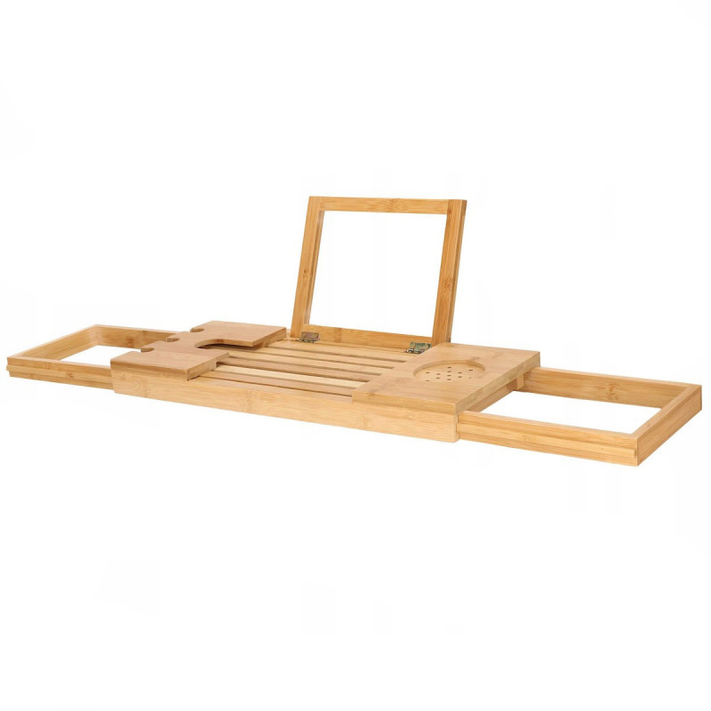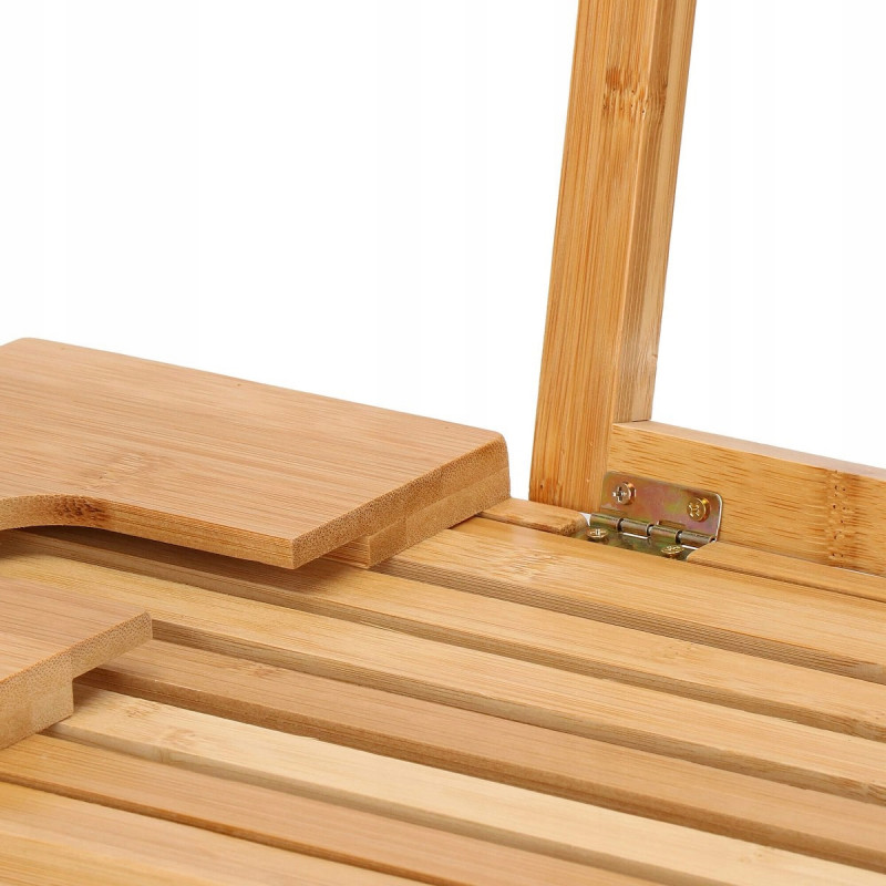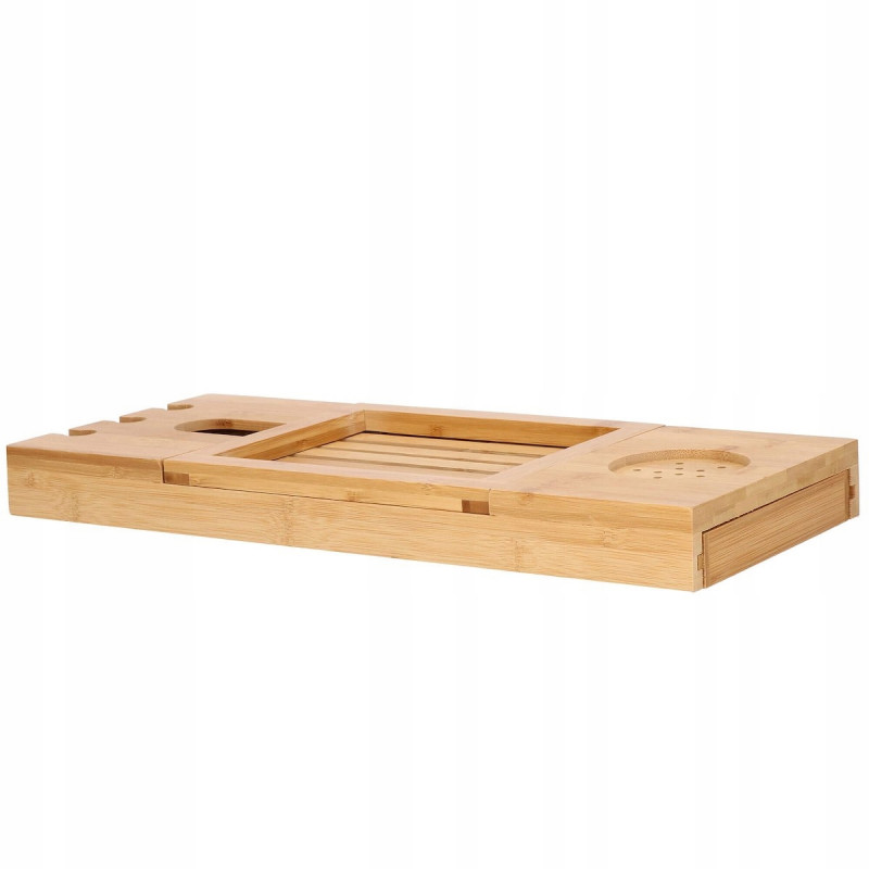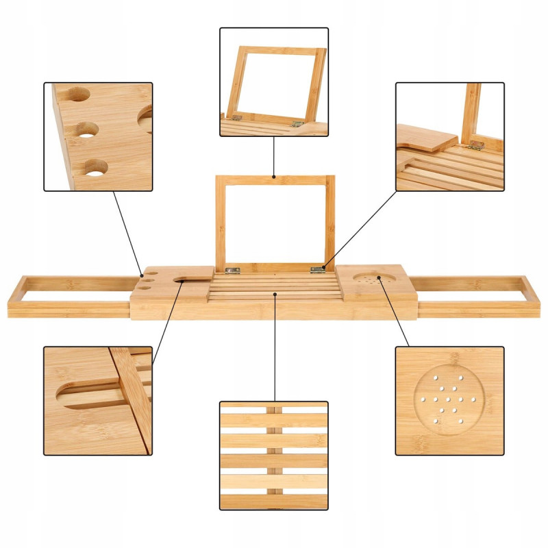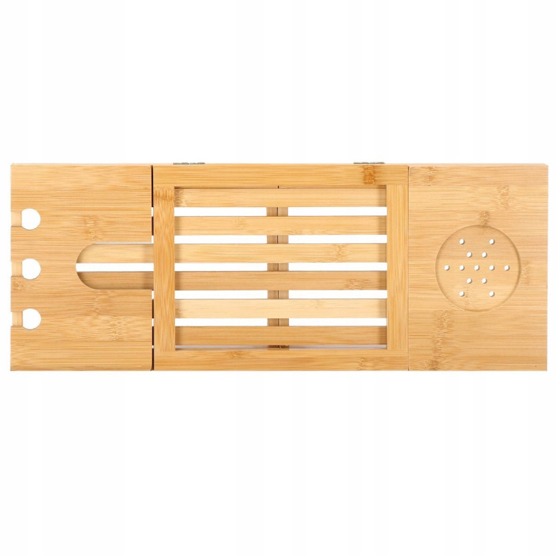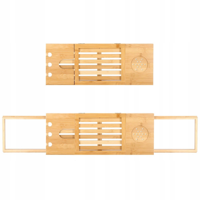 Puncte forte: stabilitate, functionalitate, versatilitate, performanta estetica FUNCTIONALITATERaftul are o functie de reglare a latimii in intervalul 50 cm - 93 cm, datorita careia poate fi adaptat la majoritatea cazilor. Raftul este spatios, poate adaposti produse cosmetice, accesorii de baie, precum si un telefon sau o carte de citit. Produsul este realizat din bambus natural de cea mai inalta calitate, ceea ce il face durabil. Iar suprafata sa lacuita creste rezistenta la apa si mucegai. Datorita designului si functionalitatii universale, se va potrivi perfect cu decorul oricarei bai. SECURITATEIn timpul unei bai relaxante, nu trebuie sa va faceti griji cu privire la dispozitivele mobile sau alte obiecte asezate pe raftul cazii, deoarece adanciturile special realizate in acesta le impiedica sa alunece de pe raft.AVANTAJE:reglare latime in intervalul 50-93 cm (se adapteaza la cada) functionalitate si comoditate fabricat din bambus natural, durabil suprafata lacuita pentru o rezistenta mai mare la apa si mucegai aspect estetic (perfect pentru orice decor de baie) suport pentru pahar de vin suport pentru tableta sau carte trei gauri pentru un pahar de vin sau sampanie coaster ventilat pentru o cana, ceasca sau lumanari loc ventilat, de exemplu pentru un prosop sau produse cosmetice Raftul pentru cada va face baia dvs. sa se simta ca intr-un SPA de lux. Utilizarea unui raft pentru cada din bambus va transforma baia dvs intr-o experienta relaxanta cu un pahar de vin, serialul preferat sau o carte. Este perfecta si ca organizator pentru produse cosmetice si accesorii de baie.Raftul pentru cada va permite sa utilizati dispozitive mobile precum un telefon, tableta sau i Pad in timp ce faceti baie. Mai mult, a fost echipat cu:loc ventilat, de exemplu pentru un prosop sau produse cosmetice suport ventilat pentru o cana, cana sau lumanari suport pentru pahar de vin trei gauri pentru un pahar de vin sau sampanie