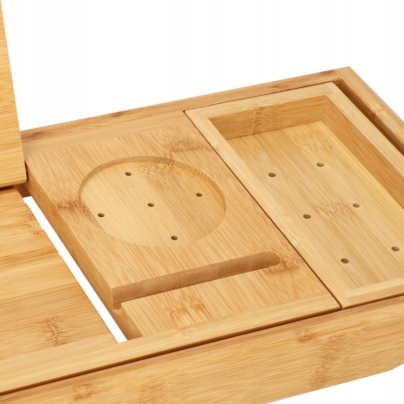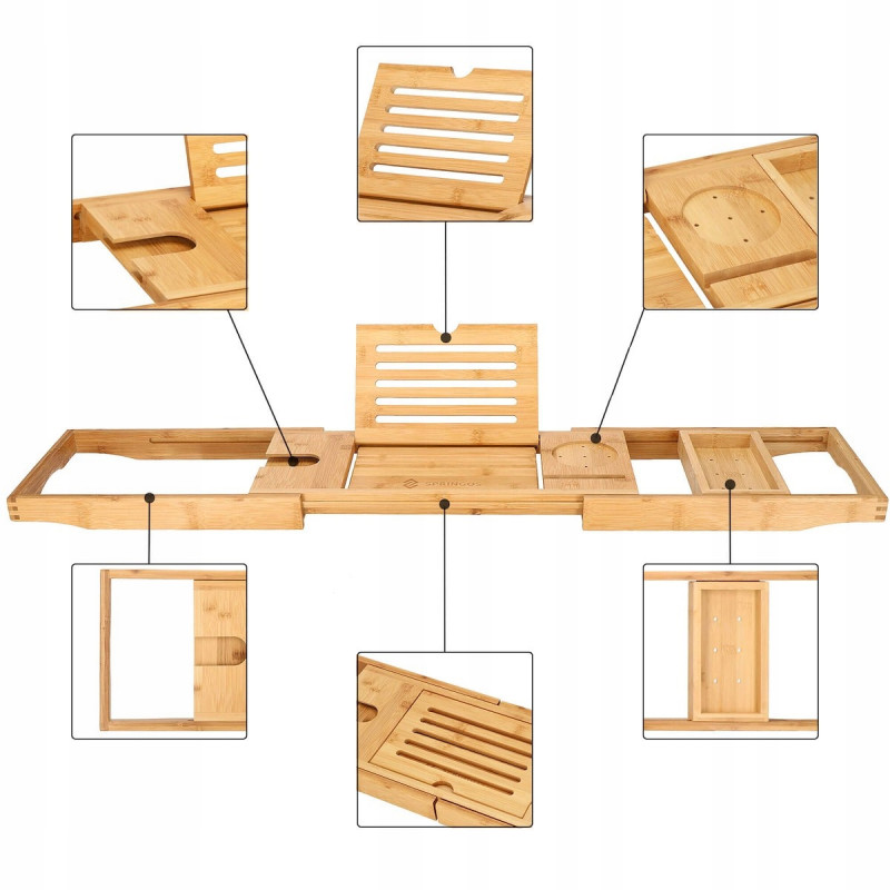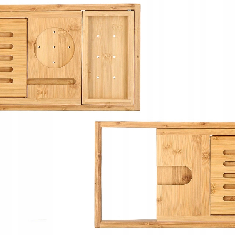 Puncte forte: stabilitate, functionalitate, versatilitate, performanta estetica Raftul pentru cada va face baia dvs. sa se simta ca intr-un SPA de lux. Utilizarea unui raft pentru cada din bambus va transforma baia dvs intr-o experienta relaxanta cu un pahar de vin, serialul preferat sau o carte. Raftul pentru cada va permite sa utilizati dispozitive mobile precum un telefon, tableta sau i Pad in timp ce faceti baie. Mai mult, a fost echipat cu: