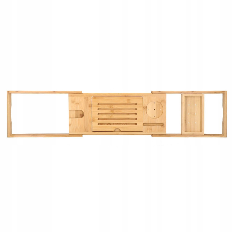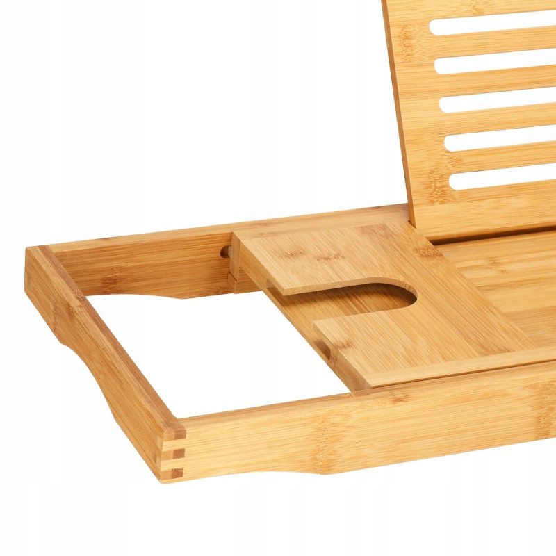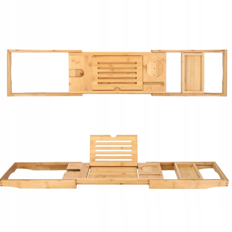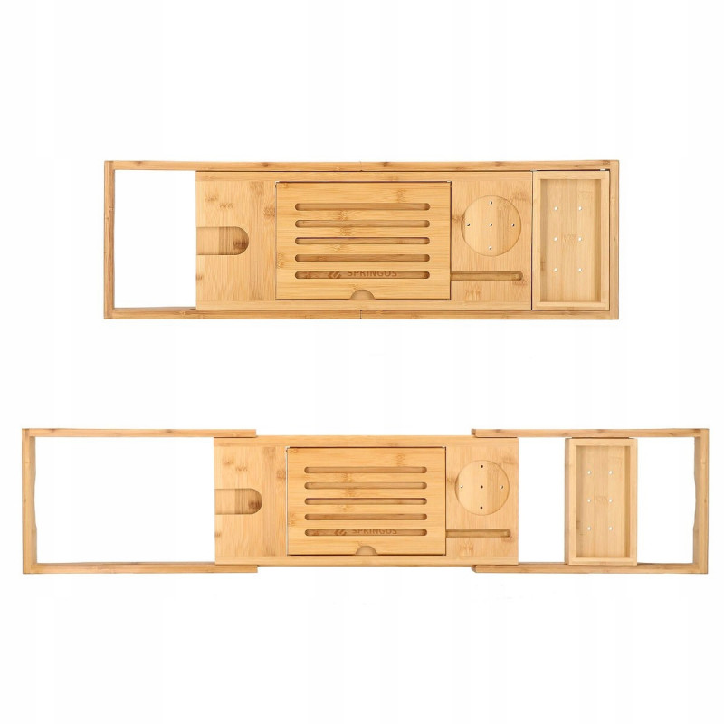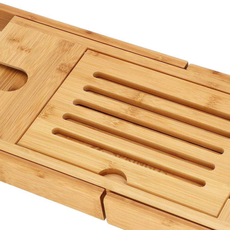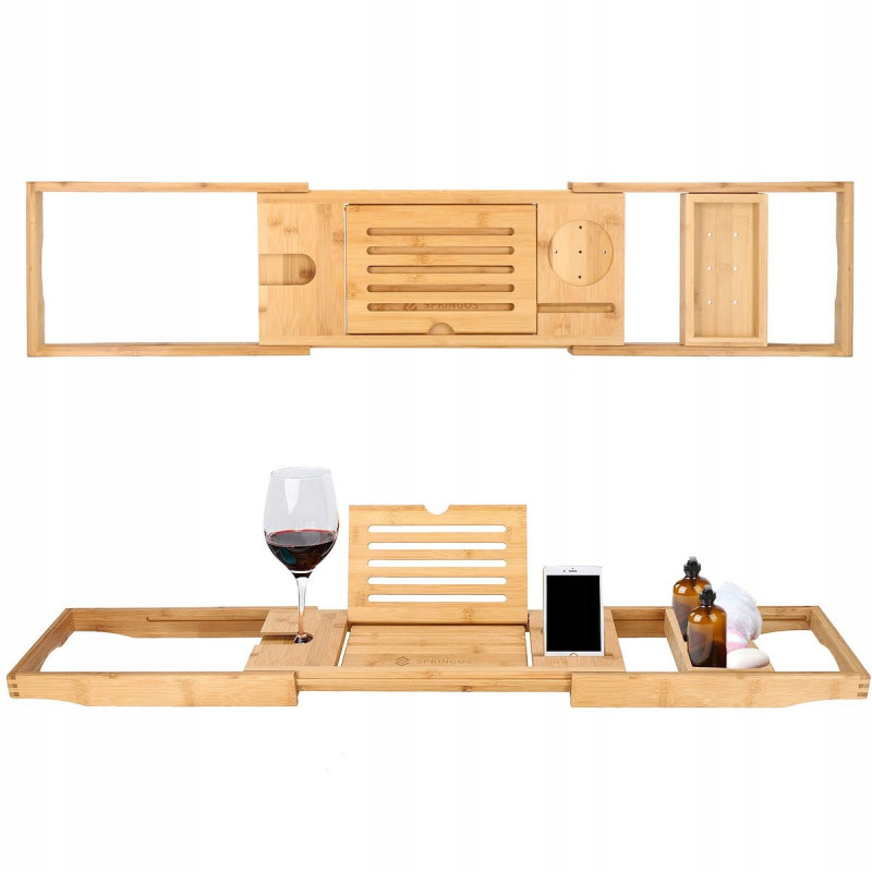 suport pentru pahar de vin FUNCTIONALITATERaftul are o functie de reglare a latimii in intervalul 75 cm - 111 cm, datorita careia poate fi adaptat la majoritatea cazilor. Raftul este spatios, poate adaposti produse cosmetice, accesorii de baie, precum si un telefon sau o carte de citit. Produsul este realizat din bambus natural de cea mai inalta calitate, ceea ce il face durabil. Iar suprafata sa lacuita creste rezistenta la apa si mucegai. Datorita designului si functionalitatii universale, se va potrivi perfect cu decorul oricarei bai. SECURITATEIn timpul unei bai relaxante, nu trebuie sa va faceti griji cu privire la dispozitivele mobile sau alte obiecte asezate pe raftul cazii, deoarece adanciturile special realizate in acesta le impiedica sa alunece de pe raft.AVANTAJE: