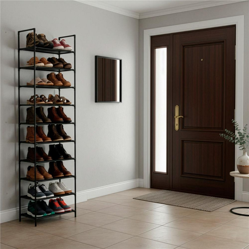 Scurta descriere: Etajera inalta cu zece polite, ideala pentru organizarea pe verticala a spatiului. Structura metalica ofera stabilitate, iar politele textile sunt potrivite pentru depozitare in dressing, camara sau spatii de depozitare.