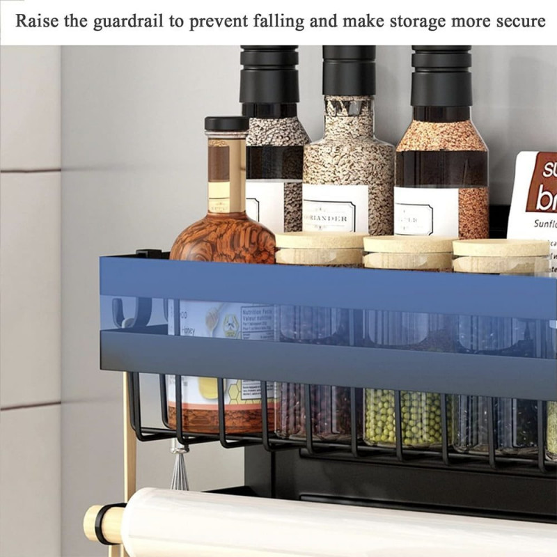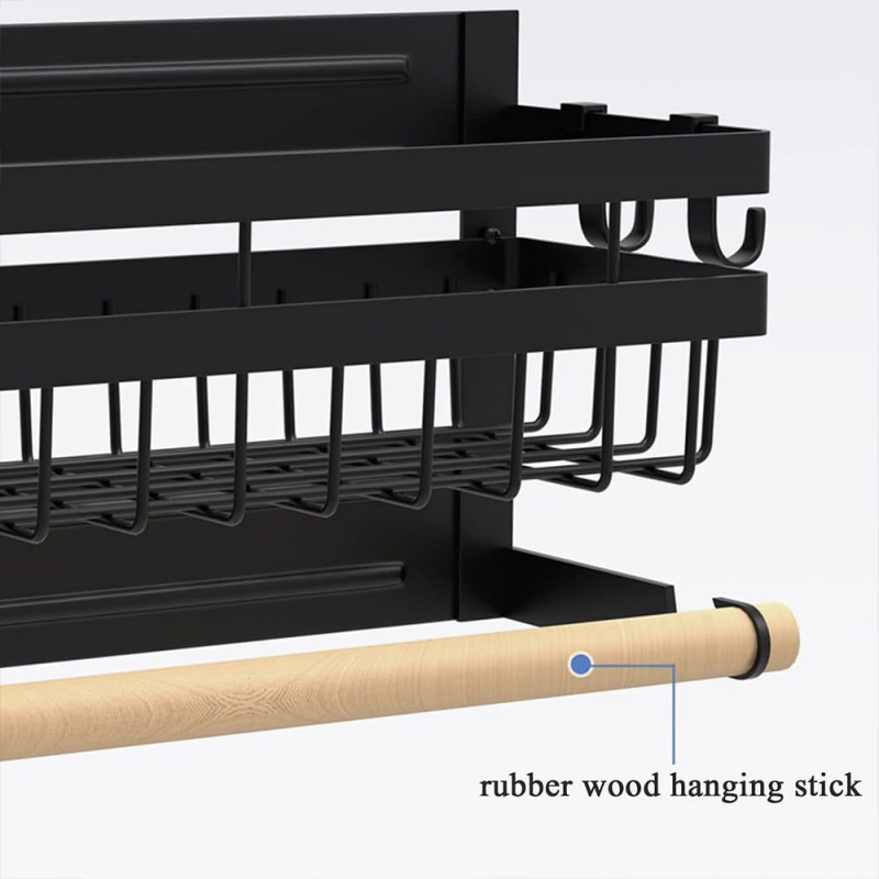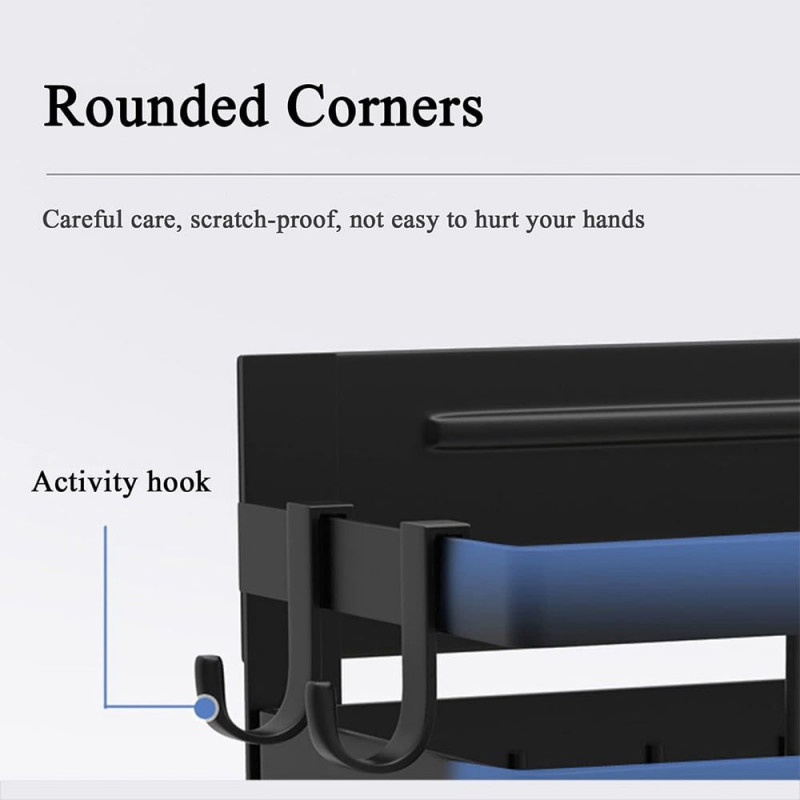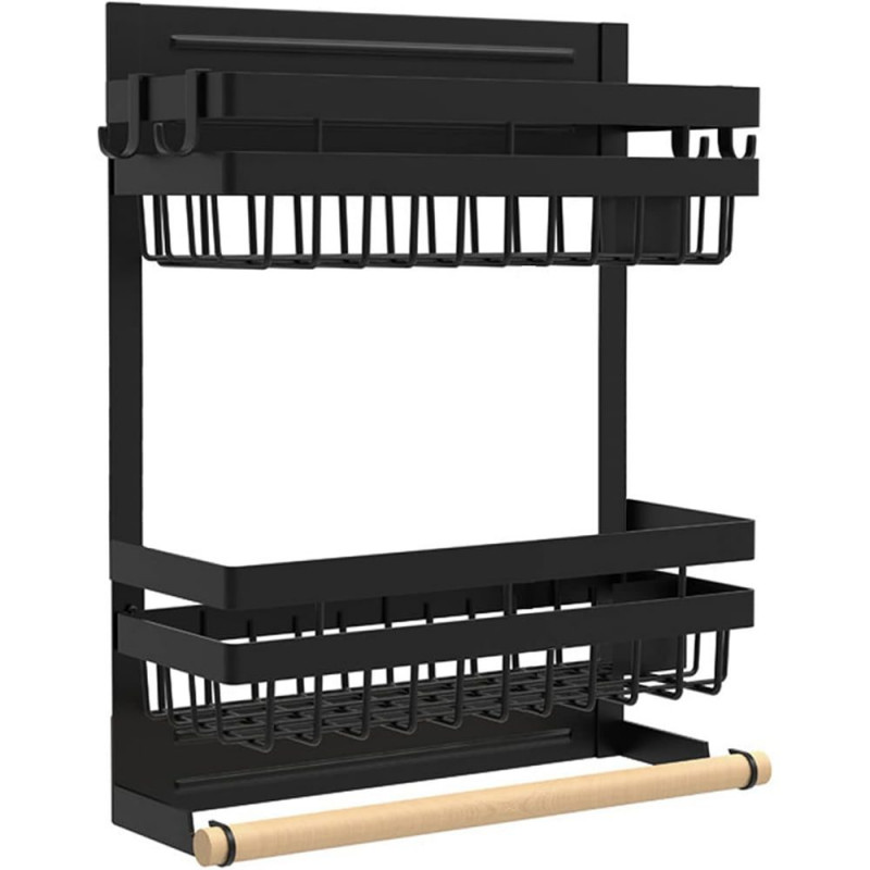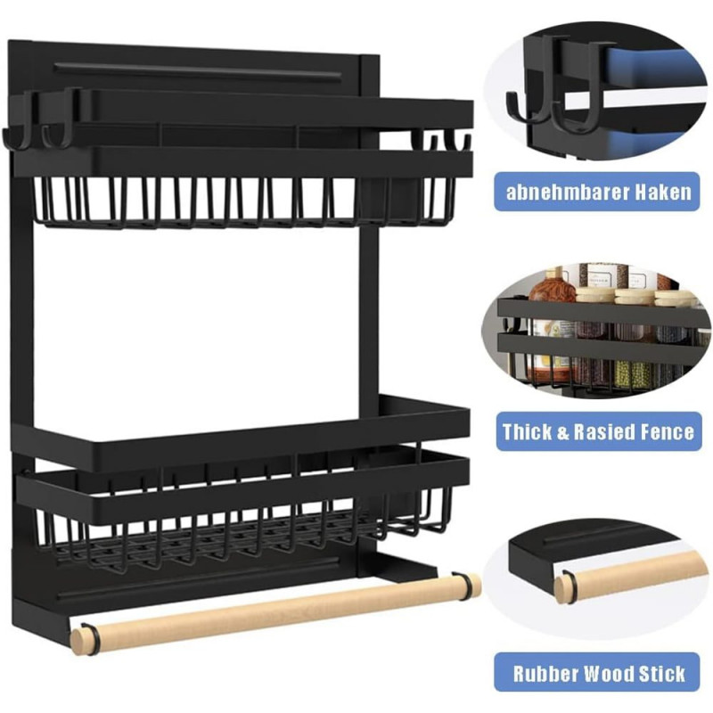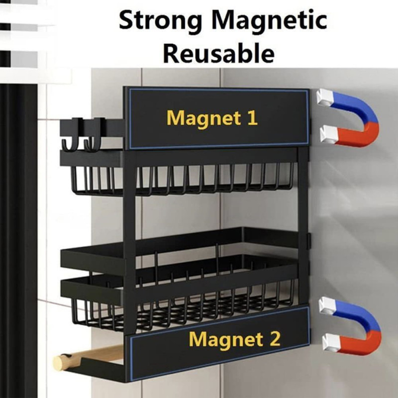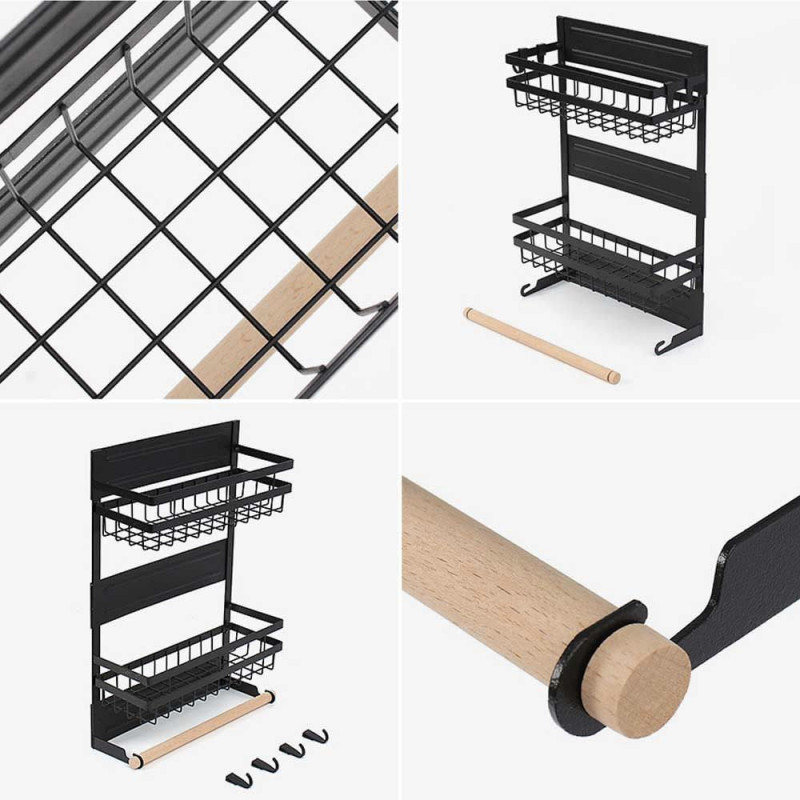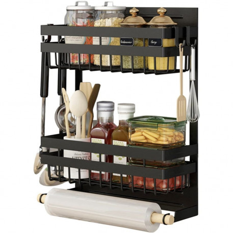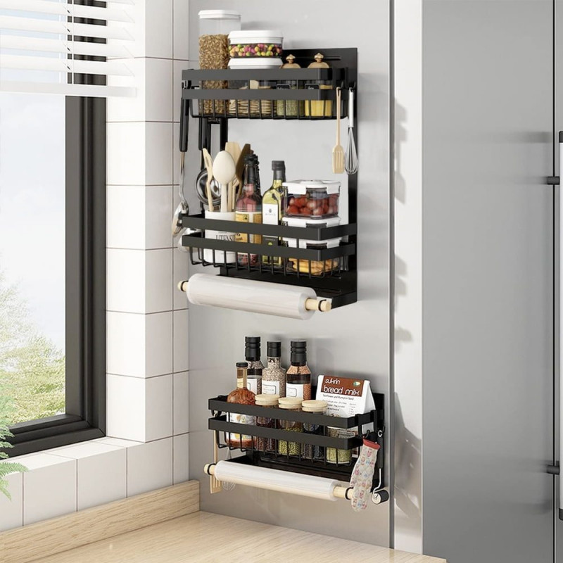 Acest produs permite stocarea intr-un mod elegant si ergonomic a condimentelor, foliei alimentare, a foliei de aluminiu precum si a rolei de hartie absorbanta. Nu mai este nevoie sa cautati dispenserele de care aveti nevoie, acum le aveti pe toate la un loc. Dispozitivul are prindere magnetica si dispune de tot ce aveti nevoie, doua rafturi pentru a stoca condimente, supotul pentru rola prosop si 4 carlige pentru agatarea diferitor ustensile.