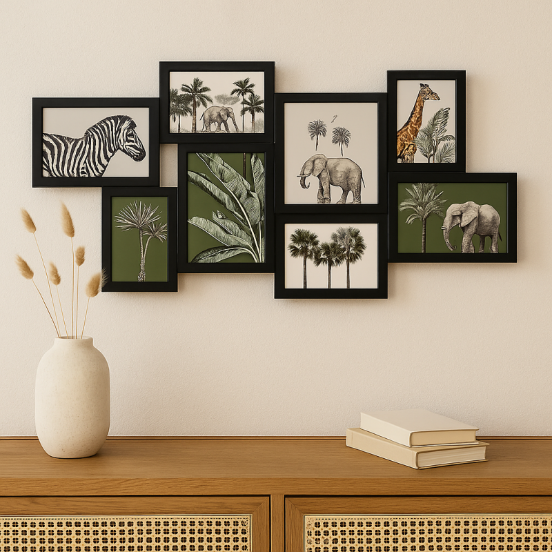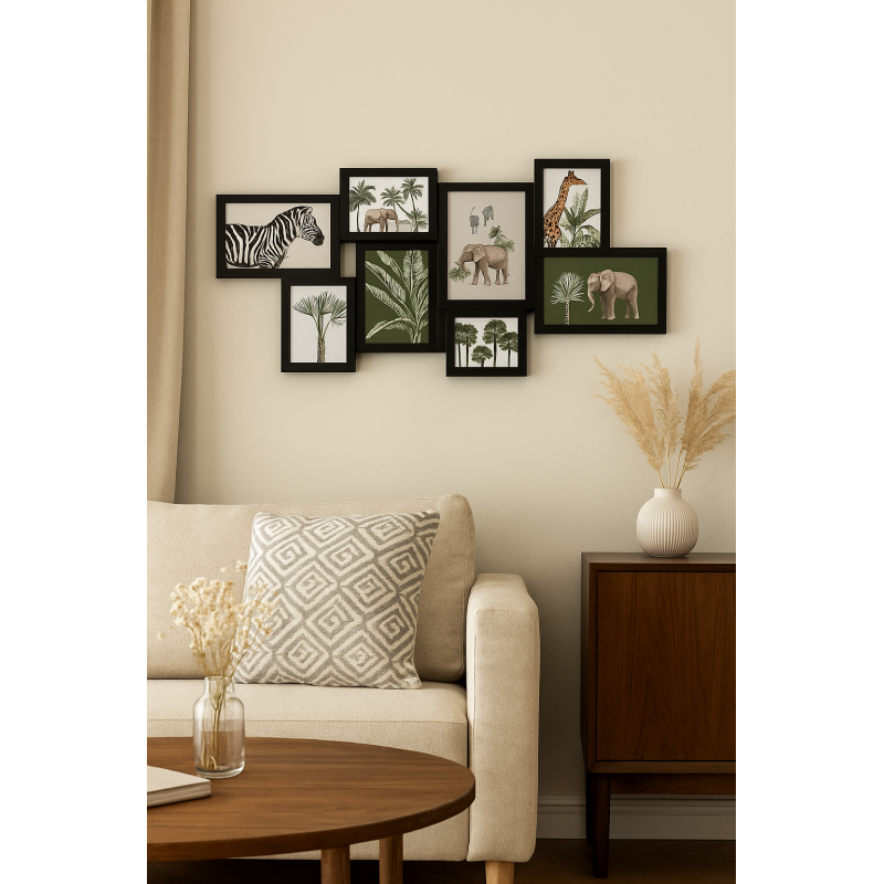 Scurta descriere: Rama colaj Atmosphera Cali este solutia ideala pentru a pastra si expune cele mai dragi amintiri. Cu un design asimetric si modern, cele opt rame de dimensiuni variate creeaza un efect vizual armonios. Se potriveste perfect intr-un decor minimalist si poate fi pusa in valoare deasupra unui bufet sau a unei console.