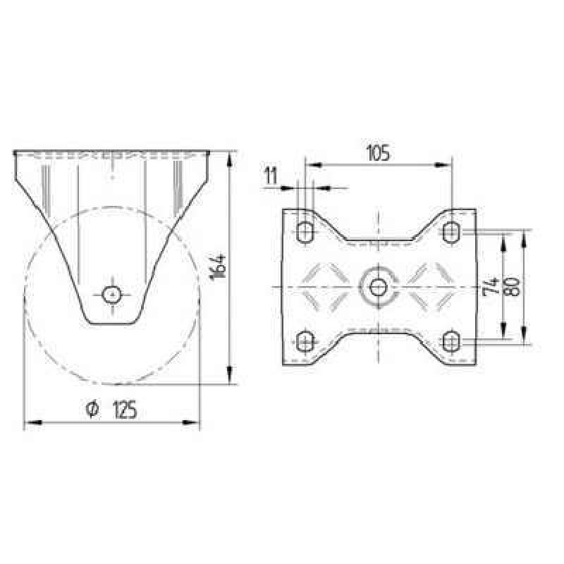Rolă fixă, furcă din tablă groasa din oţel, ambutisată, zincată, axul rotii cu surub si piulita, sistem de prindere tip placa.