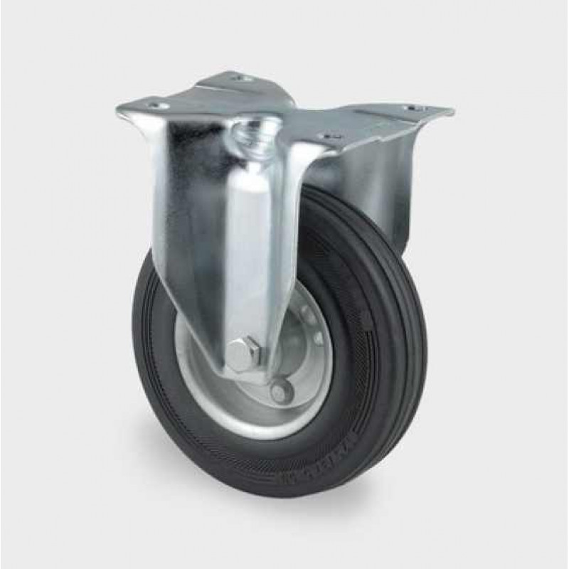 Jantă din tabla de otel, ambutisata. Suprafaţă de rulare din cauciuc plin negru, rulment cu role ace.