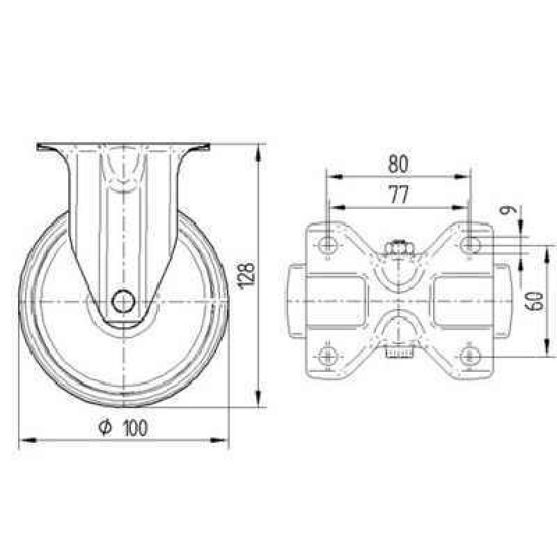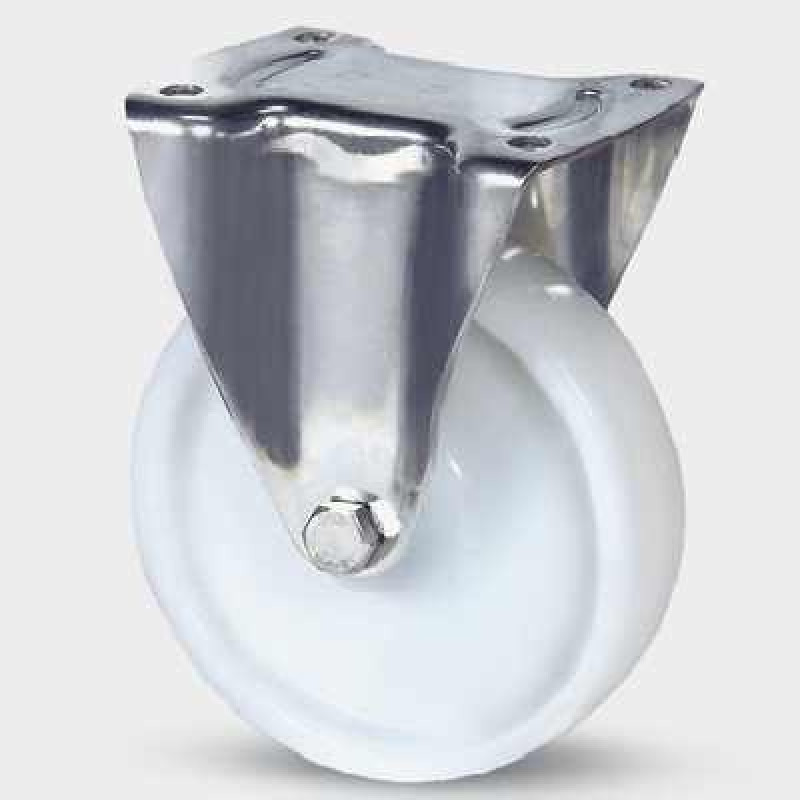 Rolă fixa din poliamida, furca din inox, ambutisată, zincata,axul rotii cu surub si piulita , sistem de prindere tip placa.