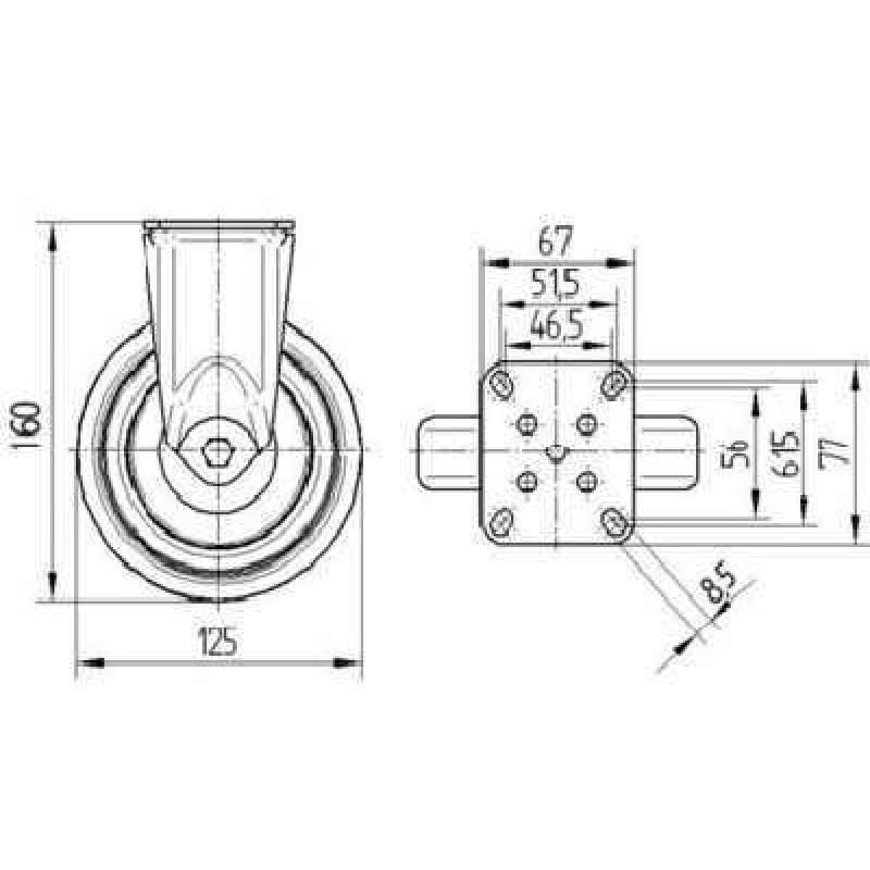 Rolă fixa, furcă din tablă din oţel, ambutisată, zinc-cromatizat, sistem de prindere tip placa,latura mai lunga a placii de fixare este perpendiculara pe directia de mers.Jantă din polipropilenă, Suprafaţă de rulare: cauciuc termoplastic, rulment plan (bucşă antifricţiune).