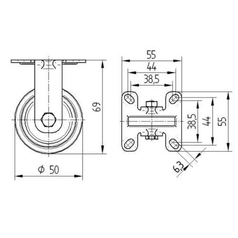 Rola fixa, furca din tabla de otel ambutisat, zinc-cromatizata, , sistem de prindere tip placa. Janta din poliamida suprafata de rulare din poliuretan, rulment de precizie cu bile, etansat , cu aparatori.