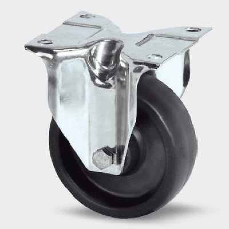 Rolă fixa, furcă din oţel inoxidabil , sistem de prindere tip placa ,axul rotii cu surb si pulita. Roata din material sintetic termorezistent, bucsa auto-lubrifianta.