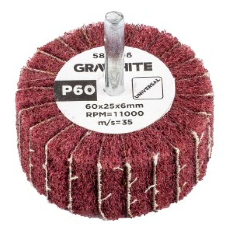 Roata cu clapeta 60 x 25 x 6 mm, P60, 58T406 de la GRAPHITE este un accesoriu cu diametrul de 60 mm, inaltimea de 25 mm, tija de 6 mm si gradatia P60 pentru utilizarea cu burghie si polizoare drepte. Roata abraziva GRAPHITE are o viteza maxima de 11.000 rpm si o viteza liniara de 35 m/s. Instrumentul permite rectificarea suprafetelor externe si interne si a zonelor greu accesibile. Roata de slefuit marca GRAPHITE se adapteaza la forma piesei de prelucrat.