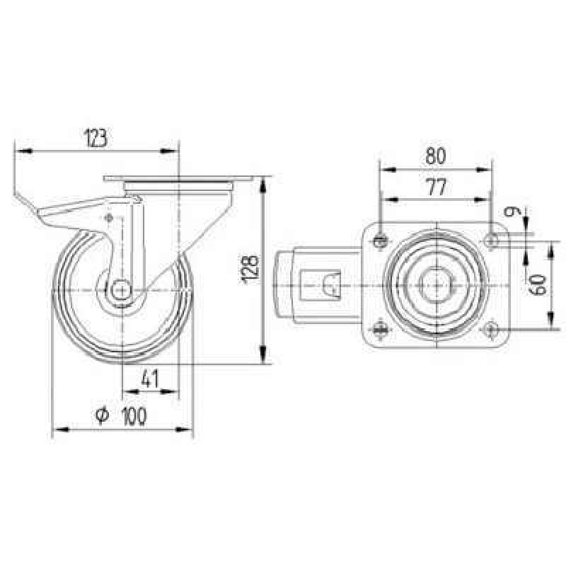 Rolă pivotantă cu frana, furcă din tablă din oţel, ambutisată, zincată, rând dublu de bile în capul pivotant,flansa antipraf , ax cu surub si piulita, janta din aluminiu,suprafata de rulare din poliuretan, rulment de precizie.