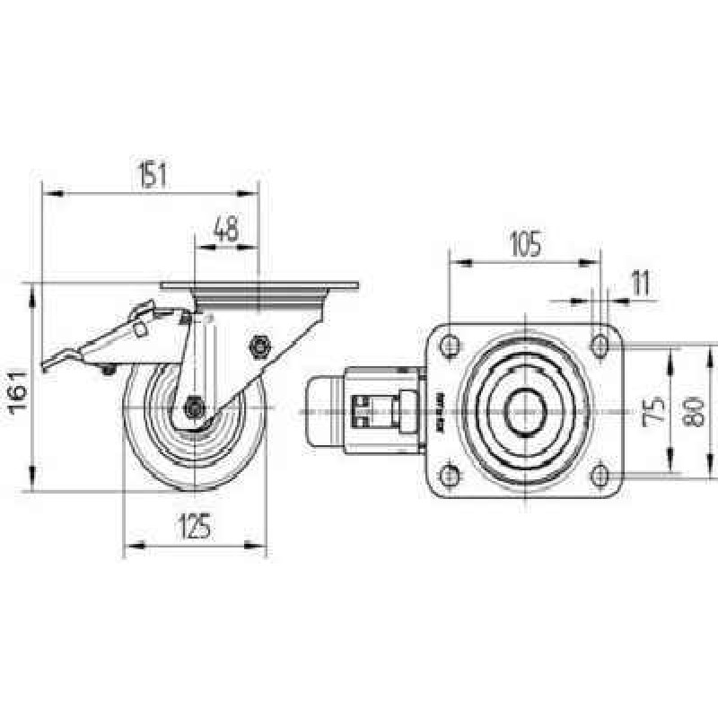 Rolă pivotantă cu frana, furcă din tablă din oţel, ambutisată, zincată, rând dublu de bile în capul pivotant,flansa antipraf , ax cu surub si piulita ,