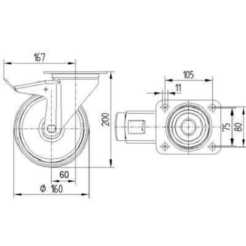 Rolă pivotantă cu frana, furcă din tablă din oţel, ambutisată, zincată, rând dublu de bile în capul pivotant,flansa antipraf , ax cu surub si piulita ,