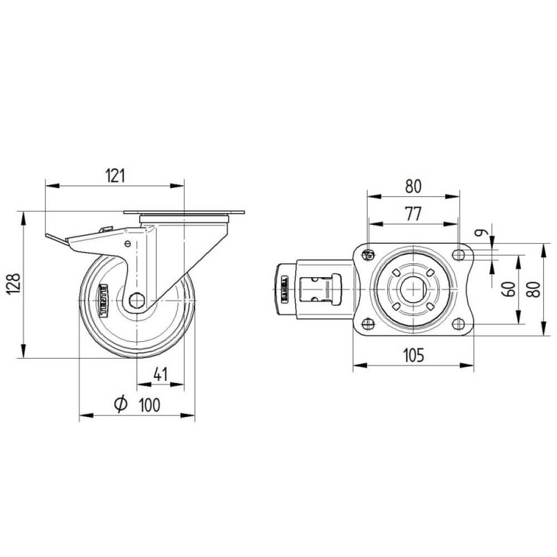 Rolă pivotantă cu frana, carcasă din tablă de oțel, construcție ranforsată, galvanizat-cromat, rulment pivotant cu cursă dublă cu bile, ax roții înșurubat, protecție rulment pivotant. Corpul roții din fontă, banda de rulare din poliuretan turnat, rulmenți cu bile de precizie.
