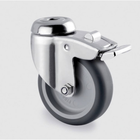 Rolă pivotantă cu frana, furcă din otel inoxidabil, bile pe doua randuri, axul rotii cu surub si piulita, alezaj pentru ax.