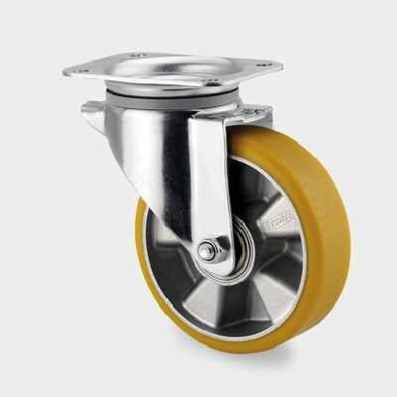 Rolă pivotantă , furcă din tablă din oţel, ambutisată, zincată, rând dublu de bile în capul pivotant,flansa antipraf , ax cu surub si piulita , janta din aluminiu,suprafata de rulare din poliuretan , rulment de precizie.