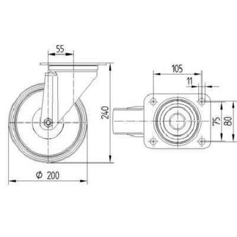Rolă pivotantă, furcă din tablă din oţel, ambutisată, zincată, cap pivotant cu rulment pe doua randuri de bile, axul rotii cu surub si piulita, flansa antipraf, sistem de prindere tip placa.Jantă din tabla de otel, ambutisata. Suprafaţă de rulare din cauciuc plin , rulment cu role ace.