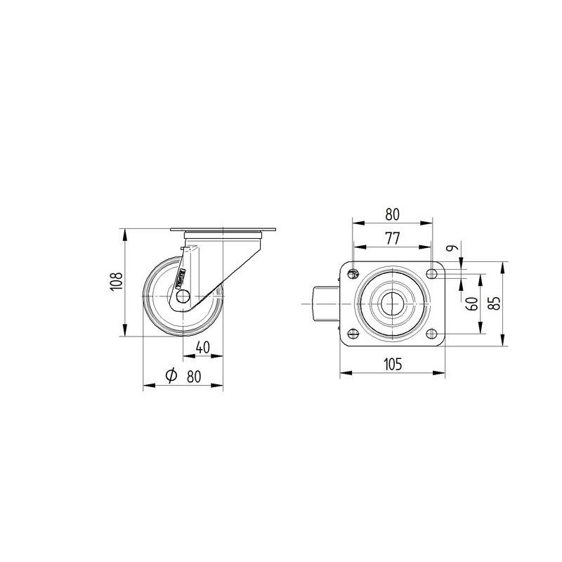 Toata pivotantă , furcă din otel, ambutisată, zincată (cromata), rând dublu de bile în capul pivotant,flansa antipraf, ax cu surub si piulita, janta din aluminiu,suprafata de rulare din poliuretan, rulment de precizie.