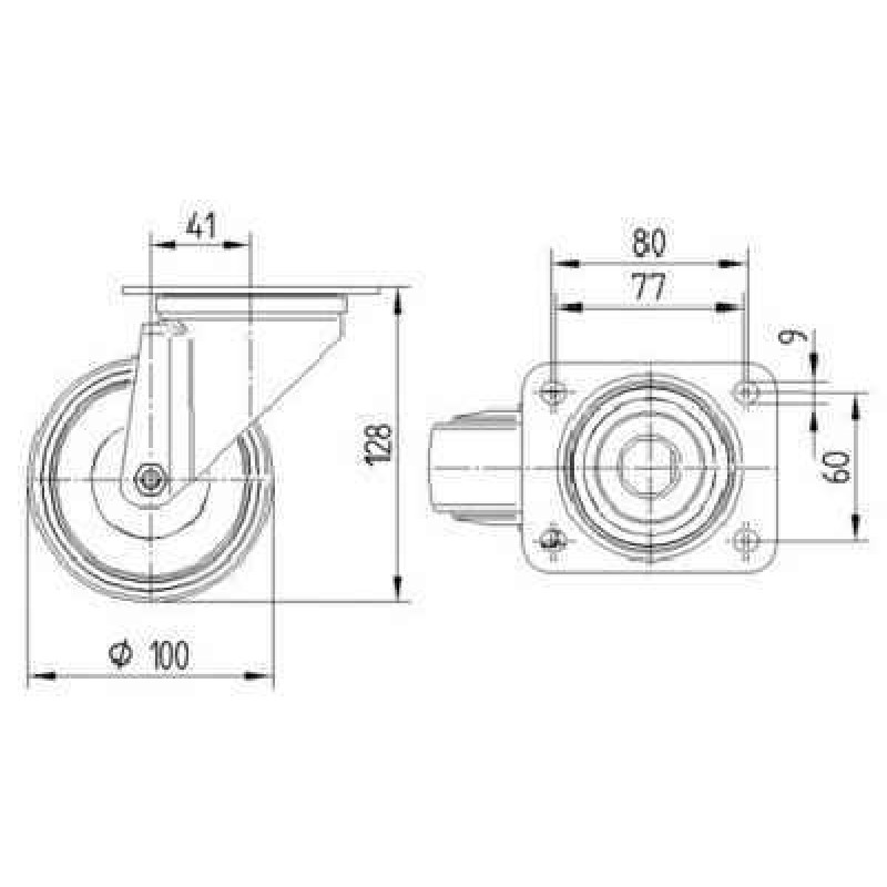 Rolă pivotantă , furcă din tablă din oţel, ambutisată, zincată, rând dublu de bile în capul pivotant, sistem de prindere tip placa ,axul rotii cu surb si piulita ,flansa antipraf.Jantă din poliamida, Suprafaţă de rulare: poliuretan, rulment cu colivie cu ace.